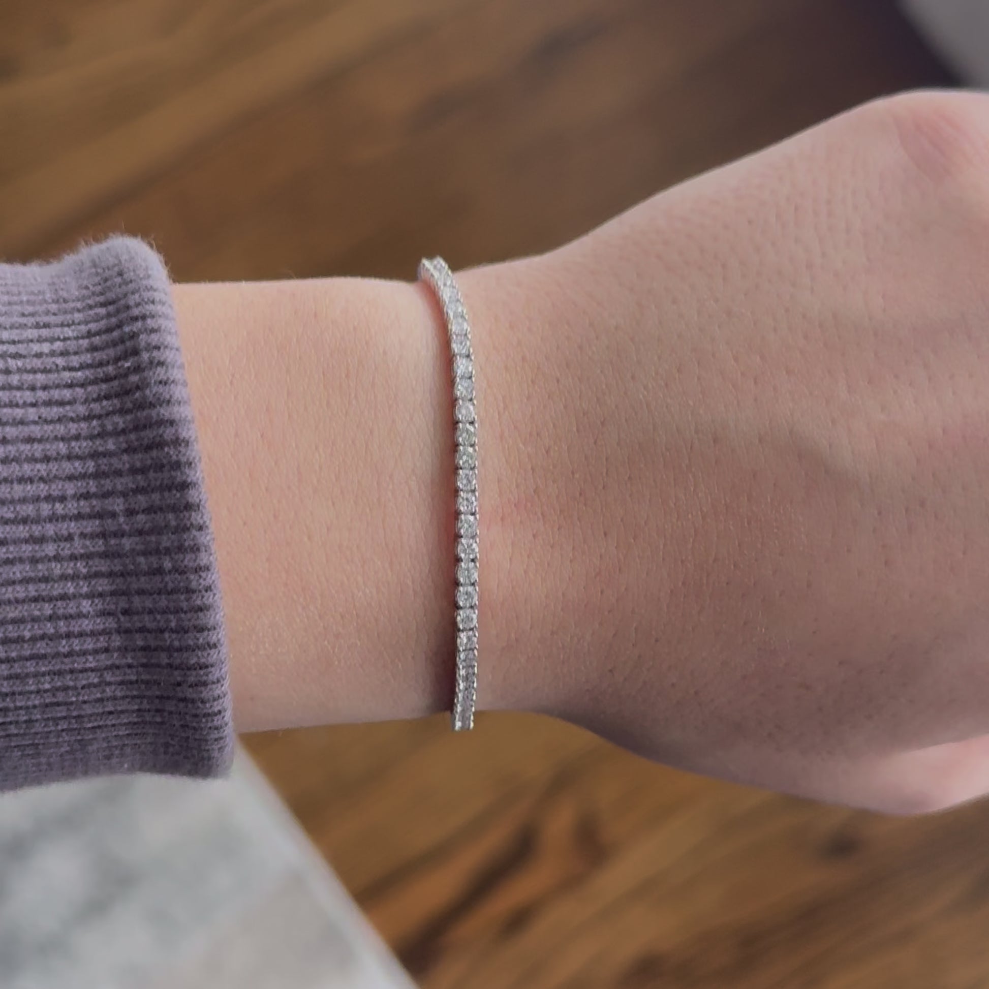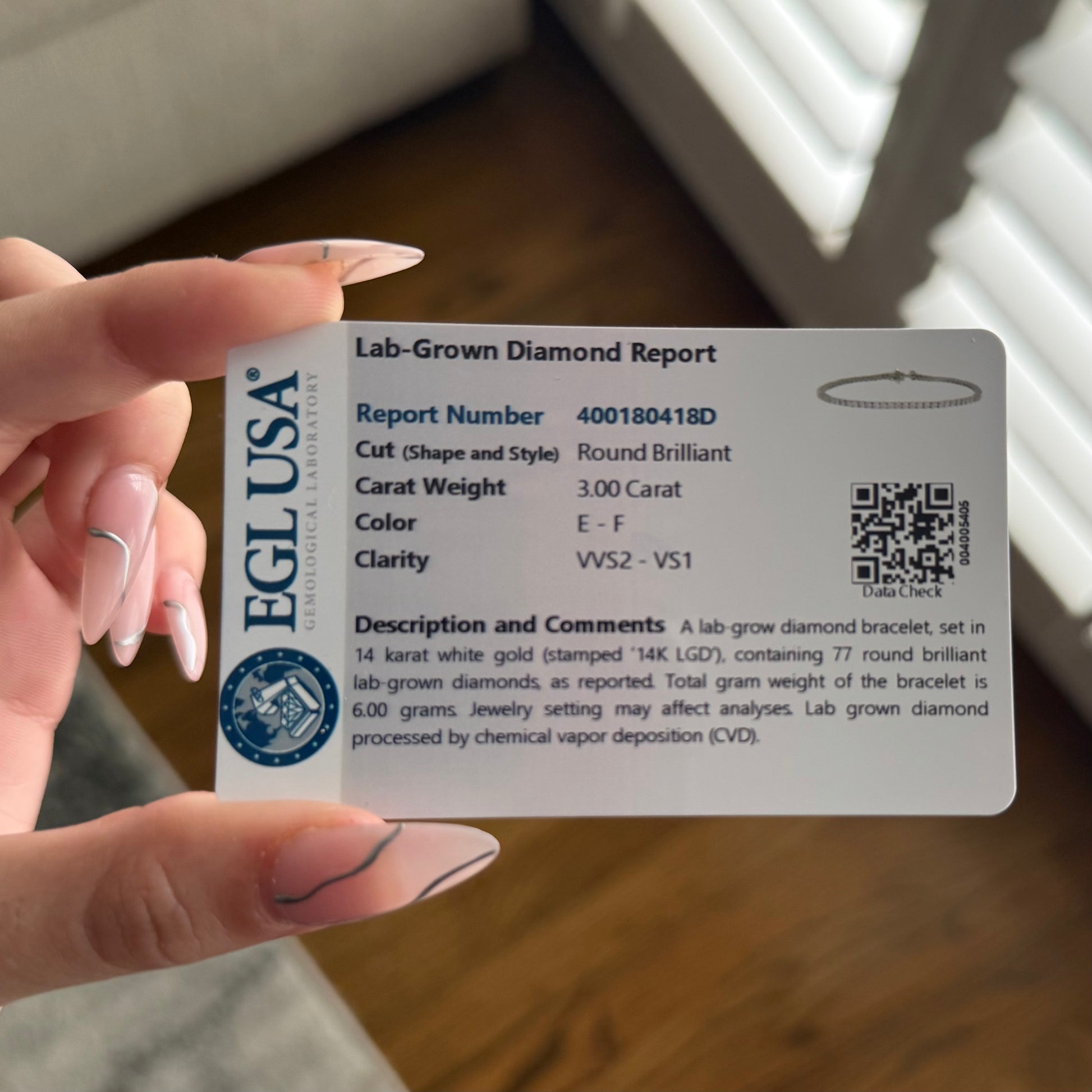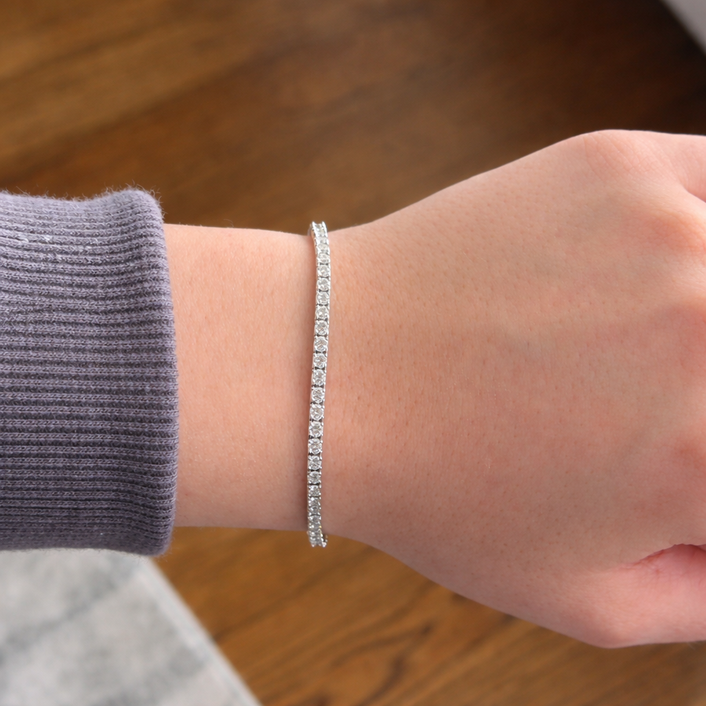 With an elegant design, 3.00 carats of E-F color VVS2-VS1 clarity lab round diamonds, and 2.30mm wide, EGL certified, this bracelet is one of a kind. Hand-set 14kt white gold is secure, its the perfect addition to any jewelry collection. This bracelet is 7 inches long and can be resized.