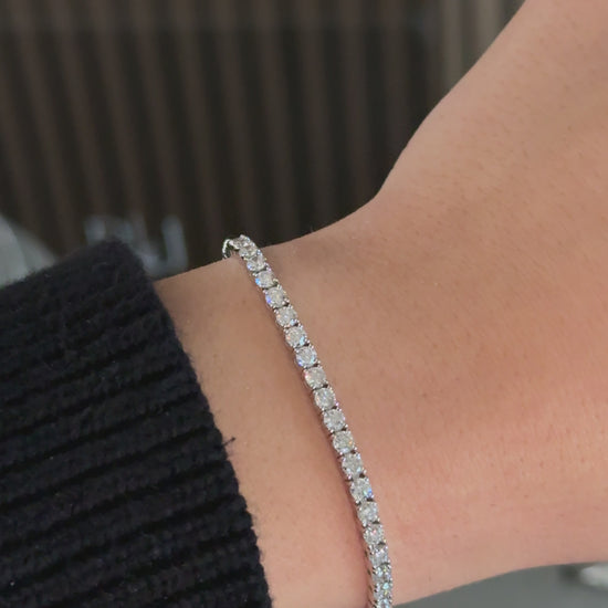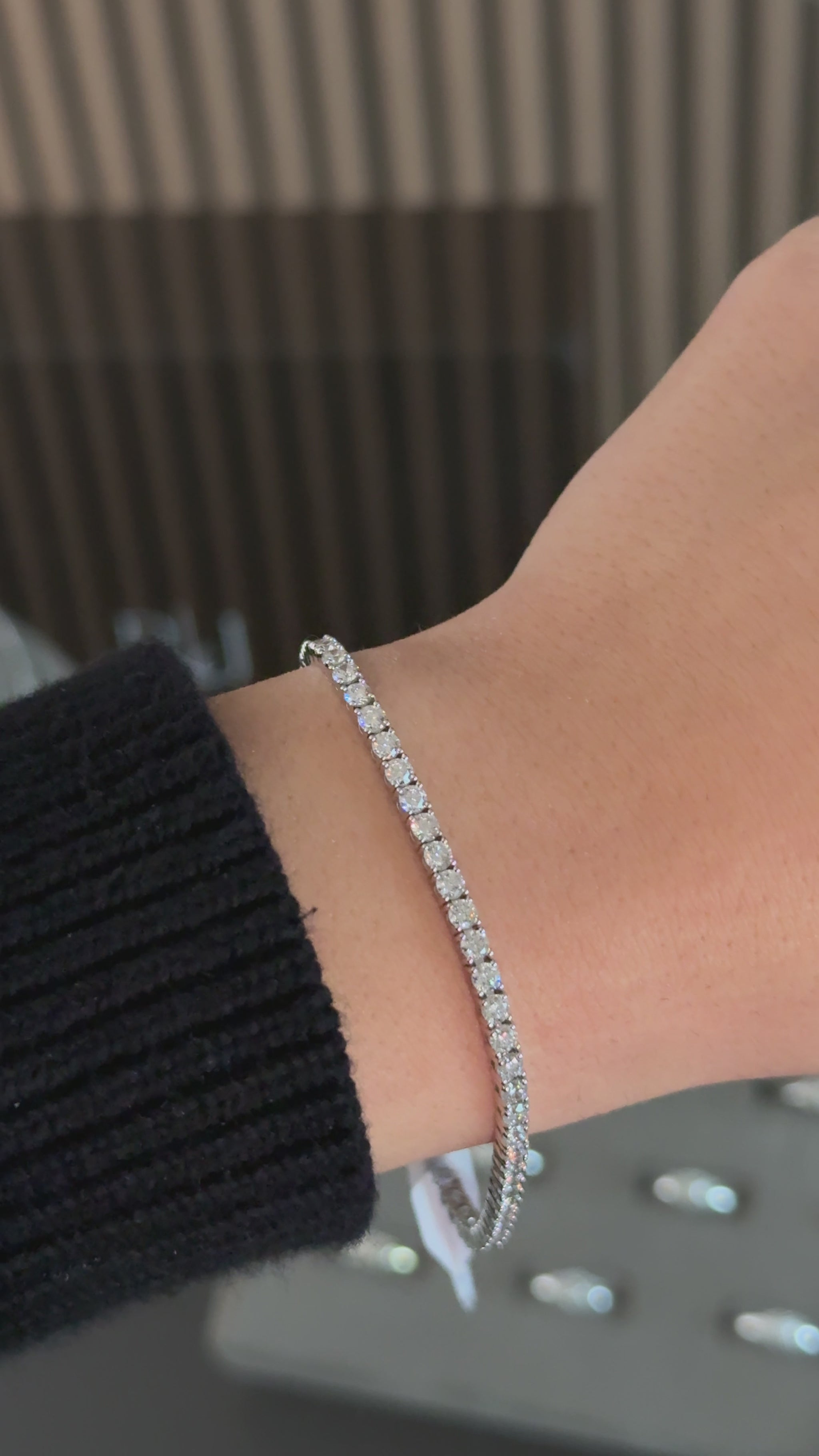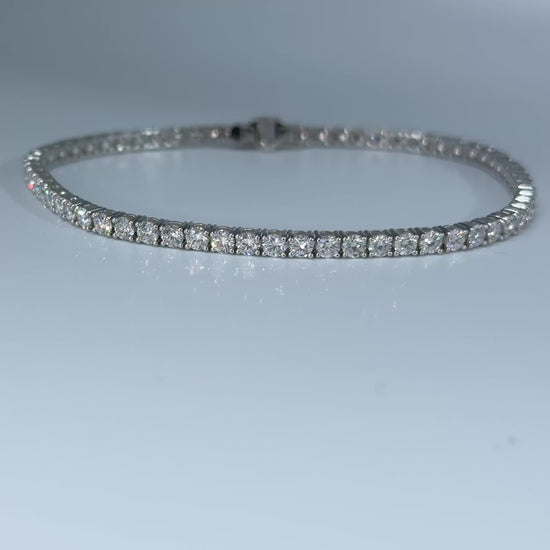 With an elegant design, 4.00 carats of E-F color VVS2-VS1 clarity lab round diamonds, and 2.75mm wide, EGL certified, this bracelet is one of a kind. Hand-set 14kt white gold is secure, its the perfect addition to any jewelry collection. This bracelet is 7 inches long and can be resized.