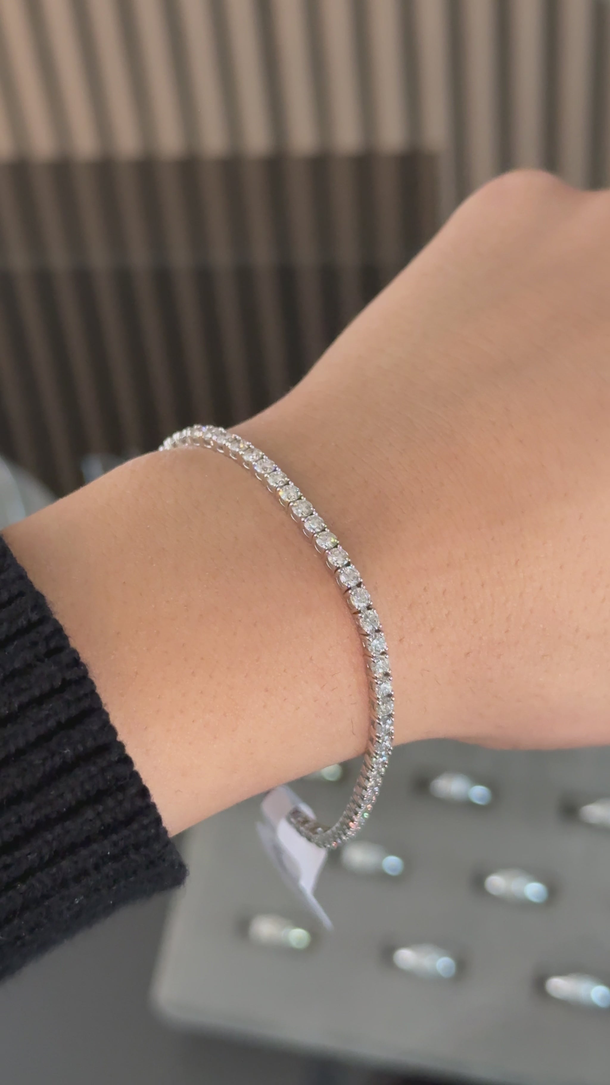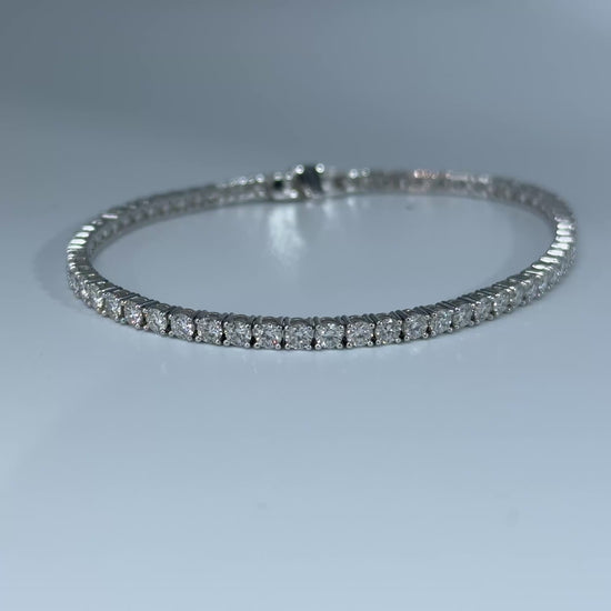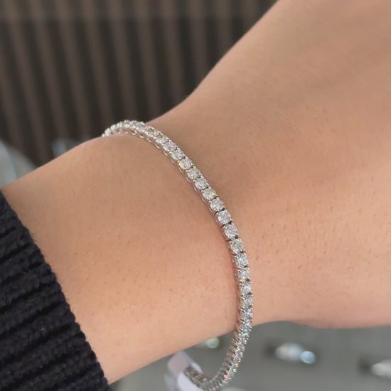 With an elegant design, 4.00 carats of E-F color VVS2-VS1 clarity lab round diamonds, and 2.75mm wide, EGL certified, this bracelet is one of a kind. Hand-set 14kt white gold is secure, its the perfect addition to any jewelry collection. This bracelet is 7 inches long and can be resized.