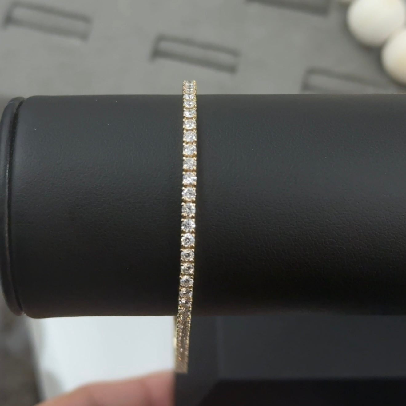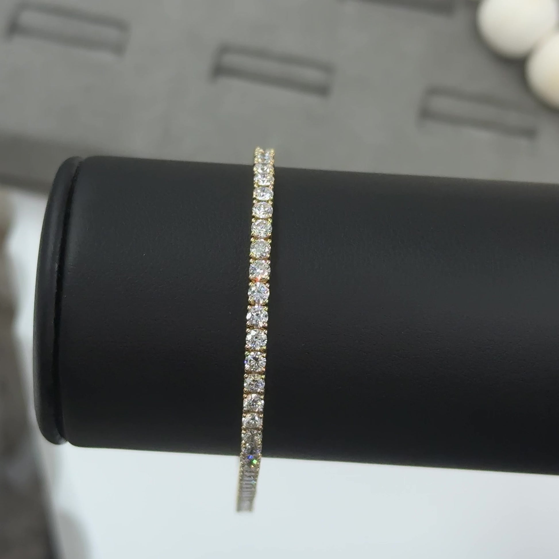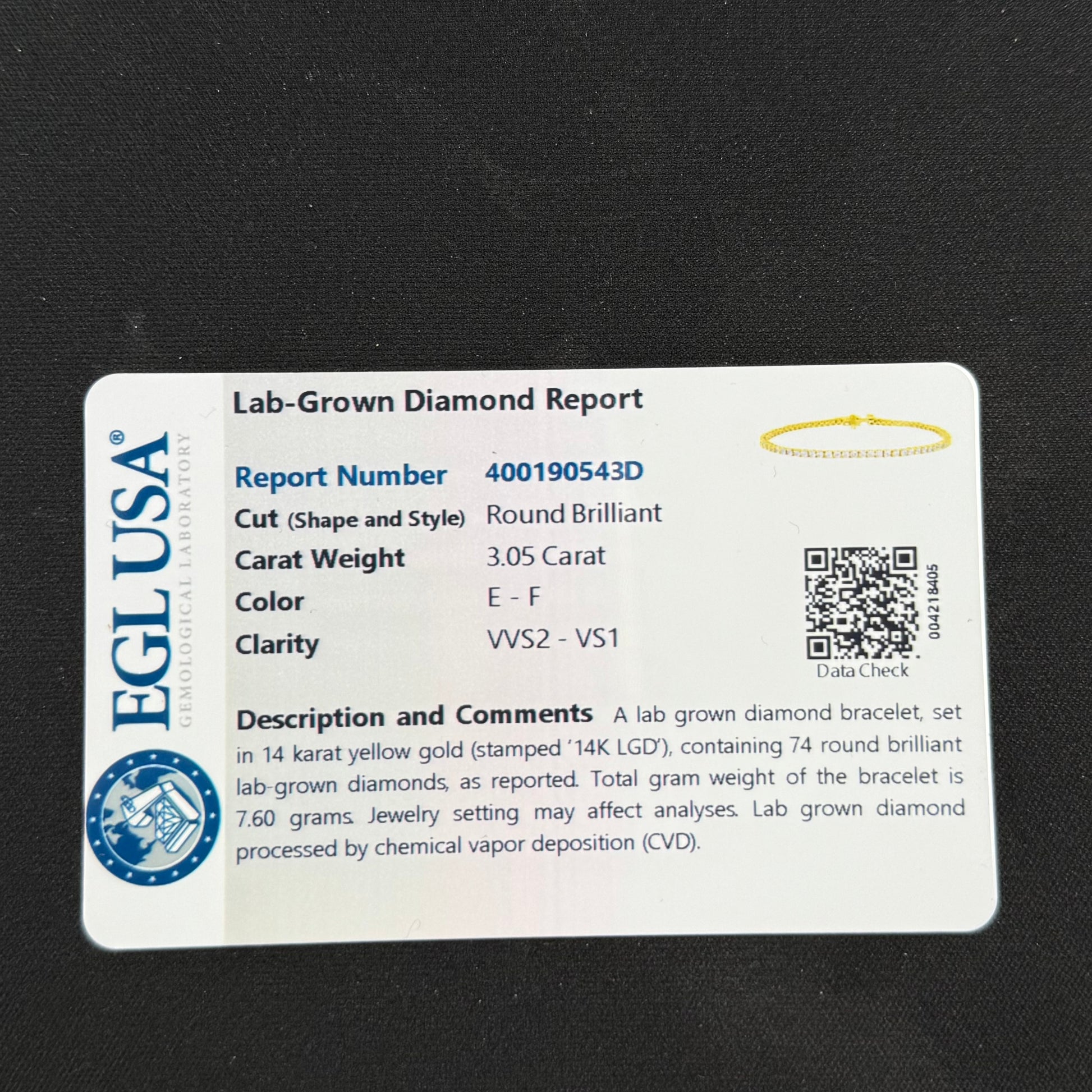 With an elegant design, 3.05 carats of E-F color VVS2-VS1 clarity lab round diamonds, and 2.50mm wide, EGL certified, this bracelet is one of a kind. Hand-set 14kt yellow gold is secure, it is the perfect addition to any jewelry collection. This bracelet is 7 inches long and can be resized.
