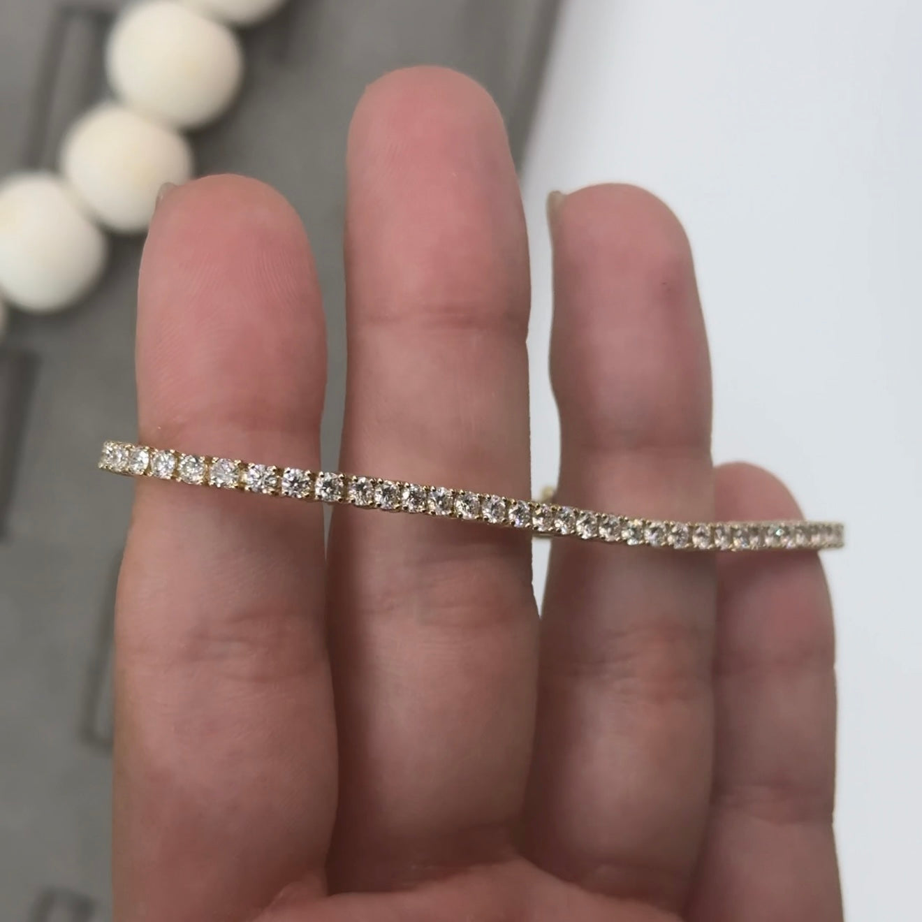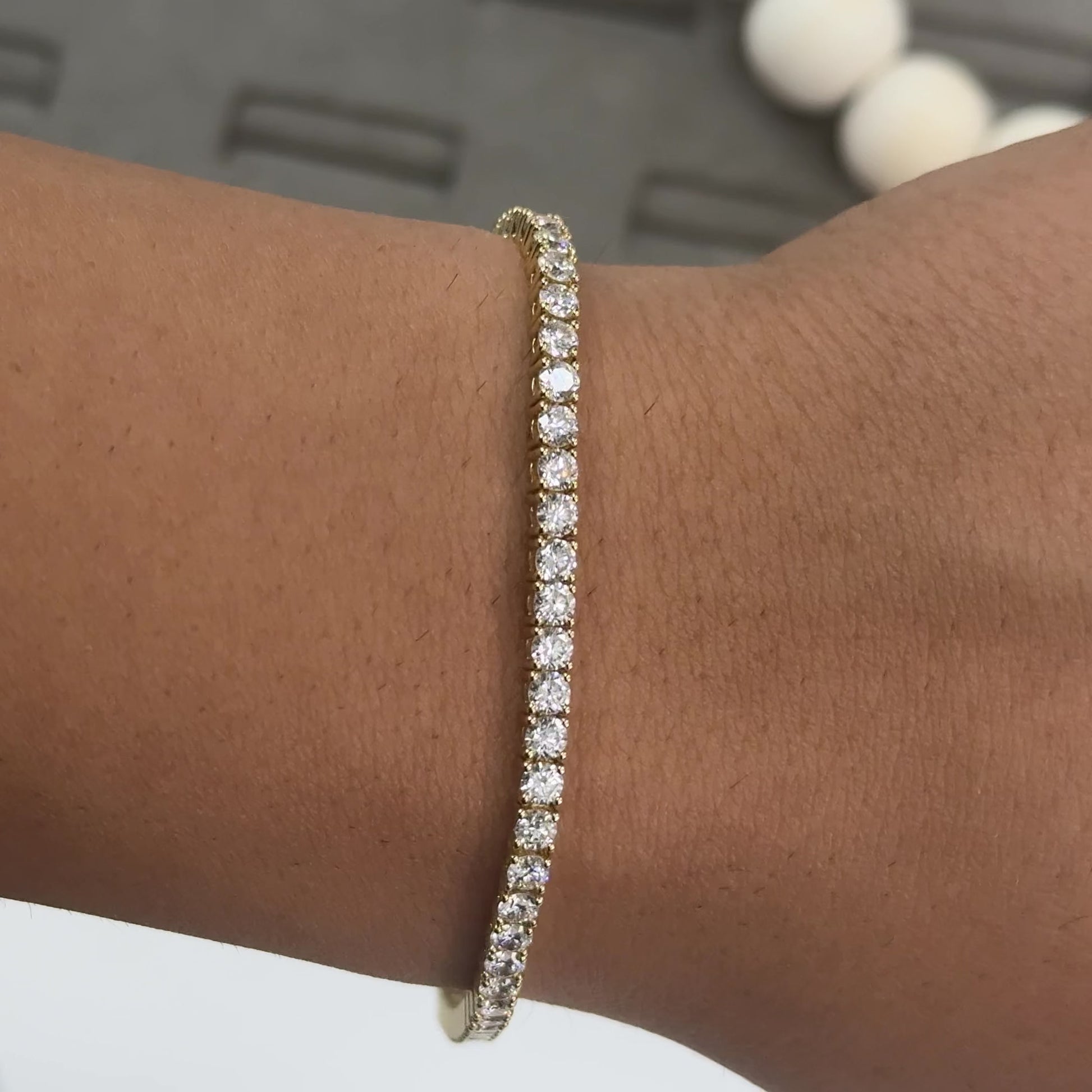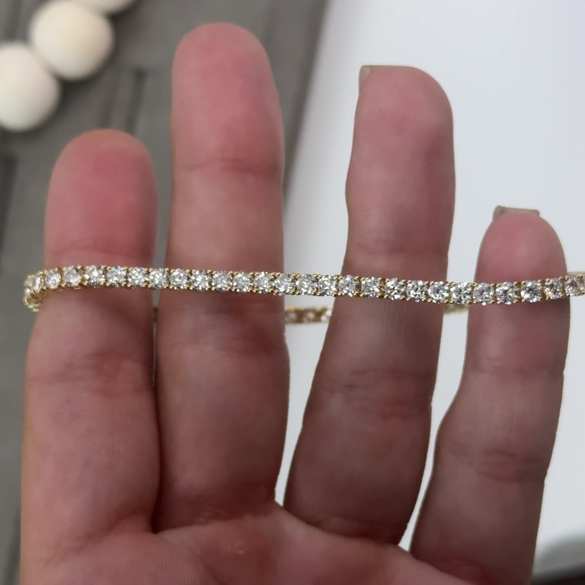 With an elegant design, 3.05 carats of E-F color VVS2-VS1 clarity lab round diamonds, and 2.50mm wide, EGL certified, this bracelet is one of a kind. Hand-set 14kt yellow gold is secure, it is the perfect addition to any jewelry collection. This bracelet is 7 inches long and can be resized.