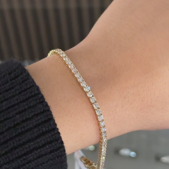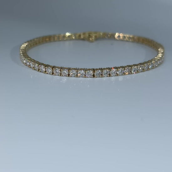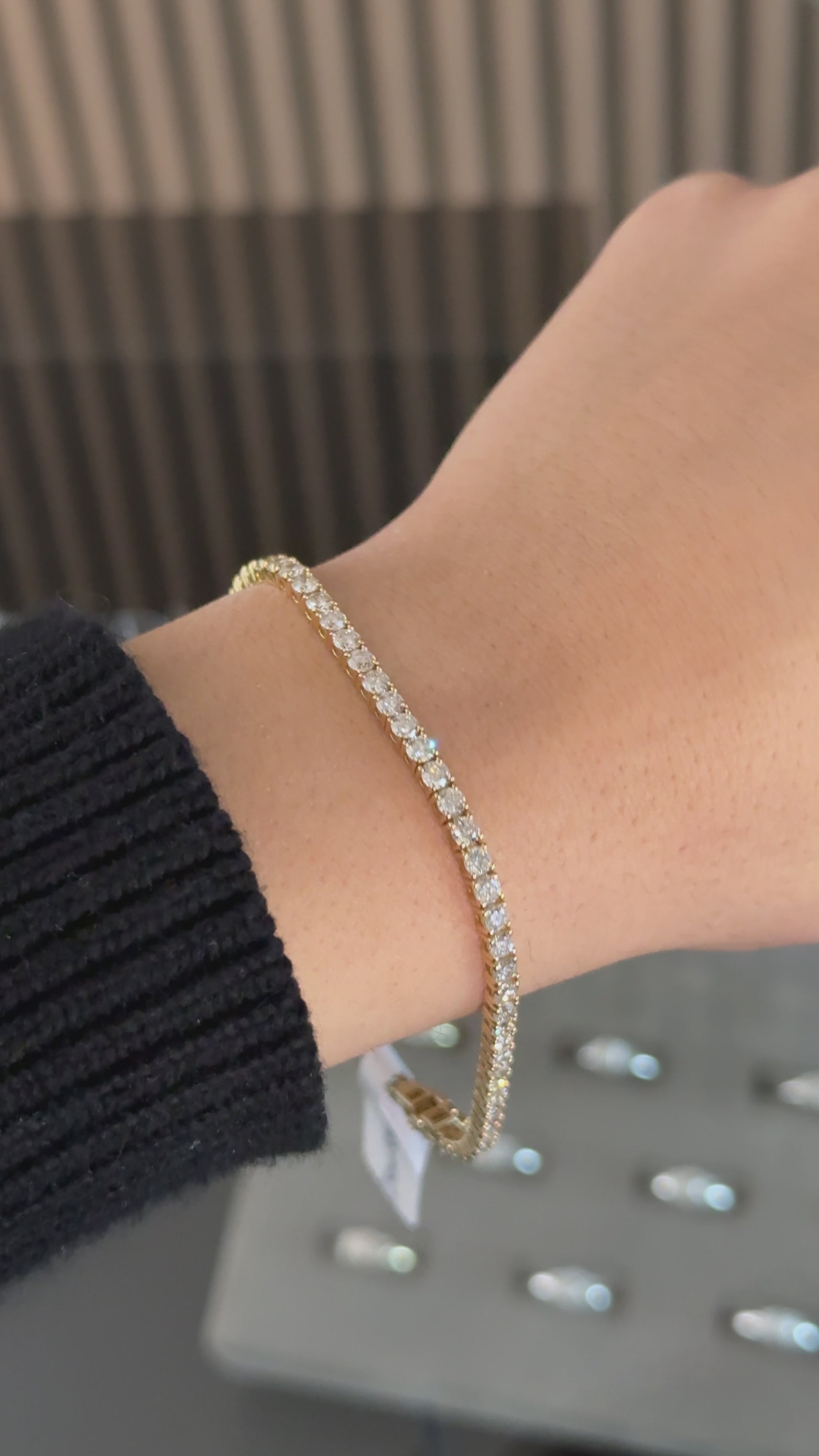 With an elegant design, 4.85 carats of E-F color VVS2-VS1 clarity lab round diamonds, EGL certified, this bracelet is one of a kind. Hand-set 14kt yellow gold is secure, it is the perfect addition to any jewelry collection. This bracelet is 7 inches long and can be resized.