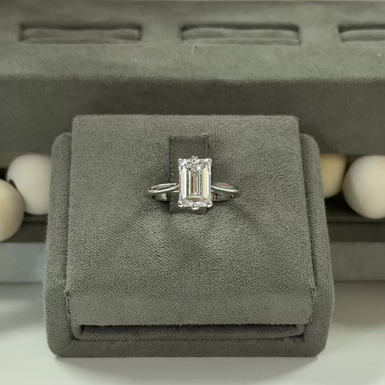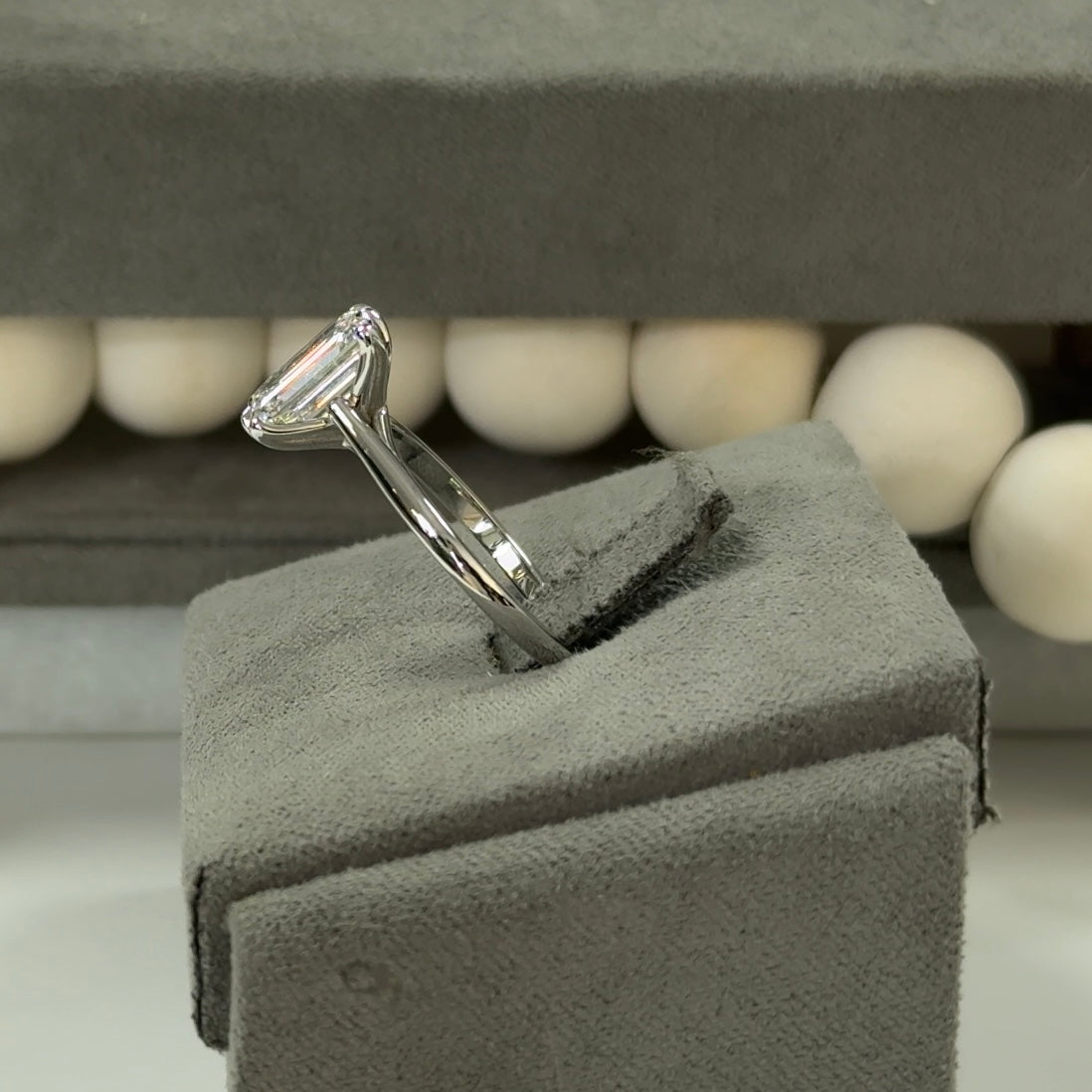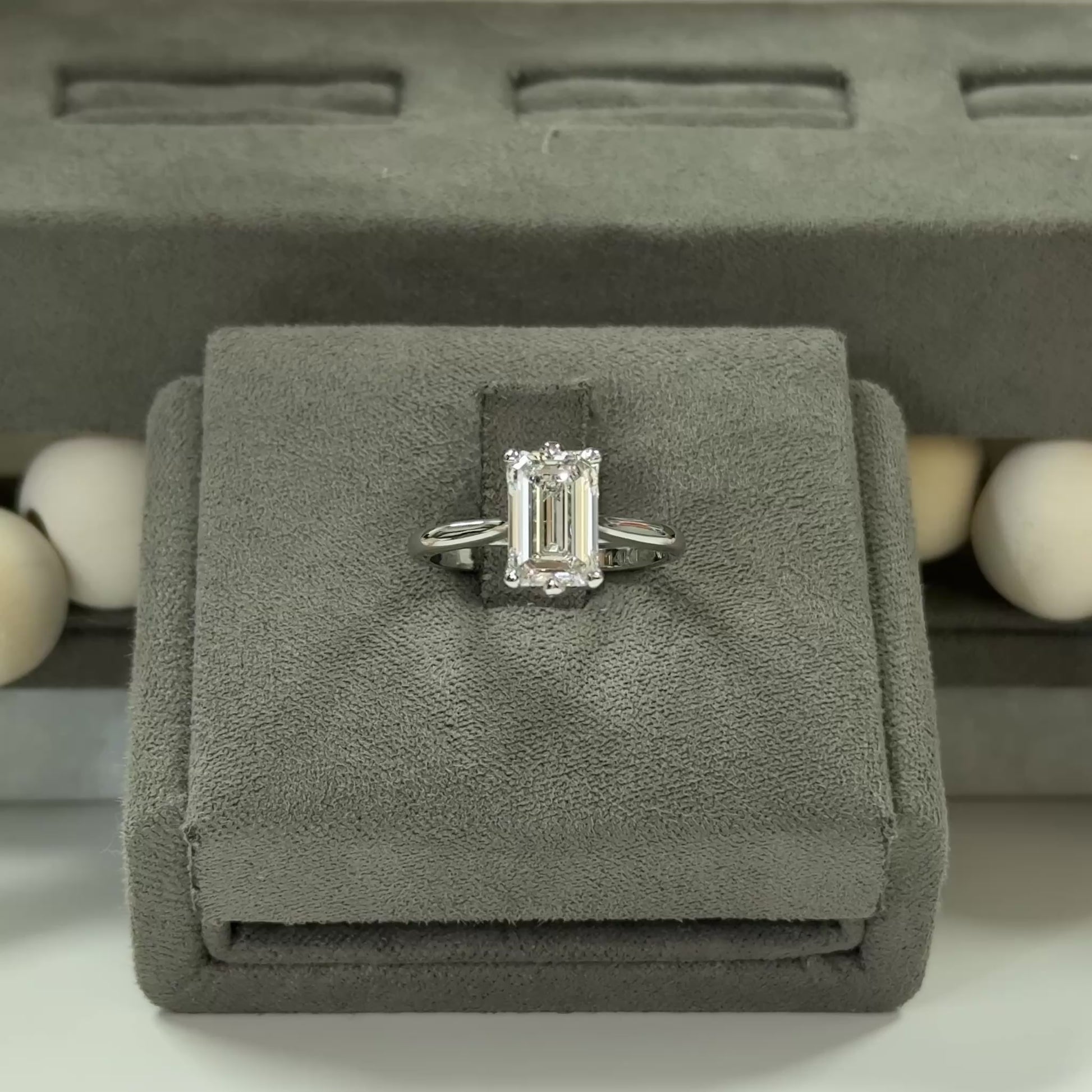 This ring showcases a 2.27 carat emerald cut lab-grown diamond, graded D color and VVS2 clarity, and certified by IGI. The emerald cut’s elongated shape and step cut faceting create exceptional elegance with a refined, hall of mirrors silhouette.