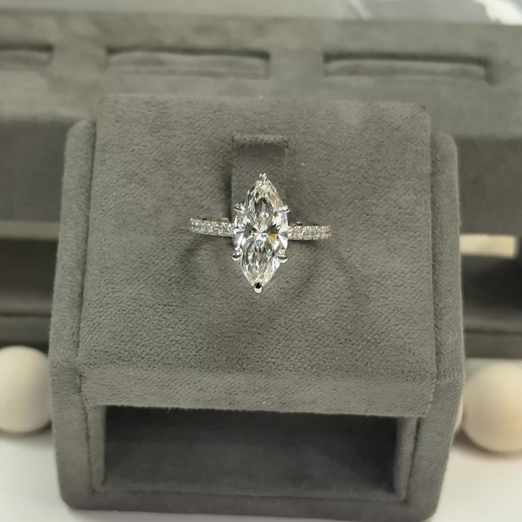 This ring showcases a 3.06 carat marquise cut lab-grown diamond, graded E color and VS1 clarity, and certified by IGI. The round cut’s elongated shape and brilliant faceting create exceptional sparkle with a refined, graceful silhouette.