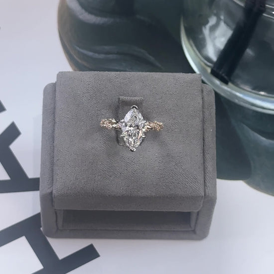 Set in a striking two-tone 14kt gold design (white gold for the prongs and yellow gold for the band), the centerstone is complemented by round lab-grown diamonds intricately set along the twisted accented band, adding dimension and brilliance. The design also incorporates a sleek, refined basket that highlights the marquise shape beautifully.