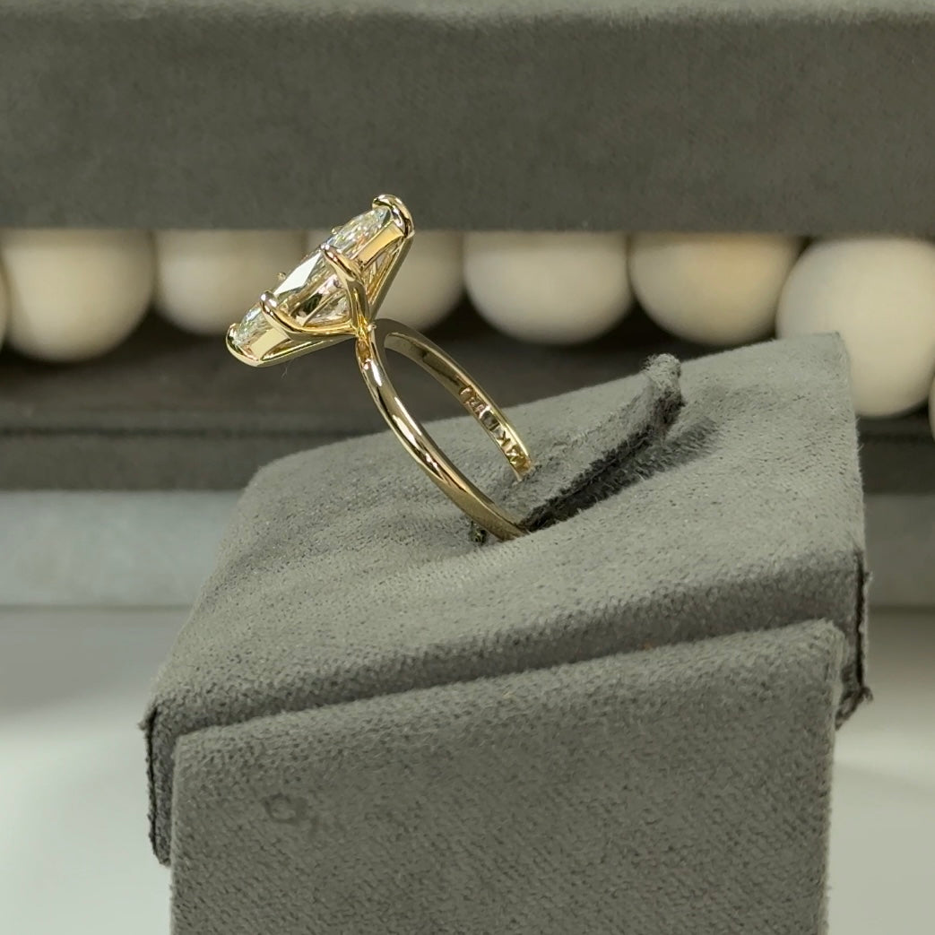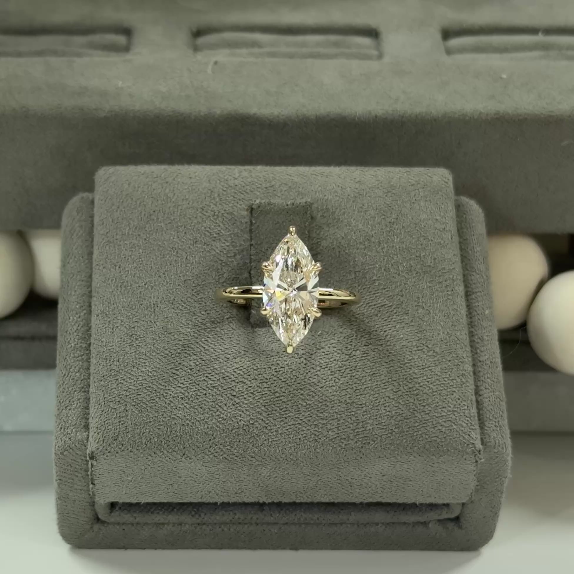 This ring showcases a 2.57 carat marquise cut lab-grown diamond, graded E color and VVS2 clarity, and certified by IGI. The marquise cut’s elongated shape and brilliant faceting create exceptional sparkle with a refined, graceful silhouette.