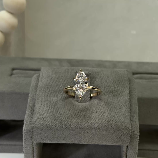 This ring showcases a 2.58 carat marquise cut lab-grown diamond, graded E color and VS1 clarity, and certified by IGI. The marquise cut’s elongated shape and brilliant faceting create exceptional sparkle.