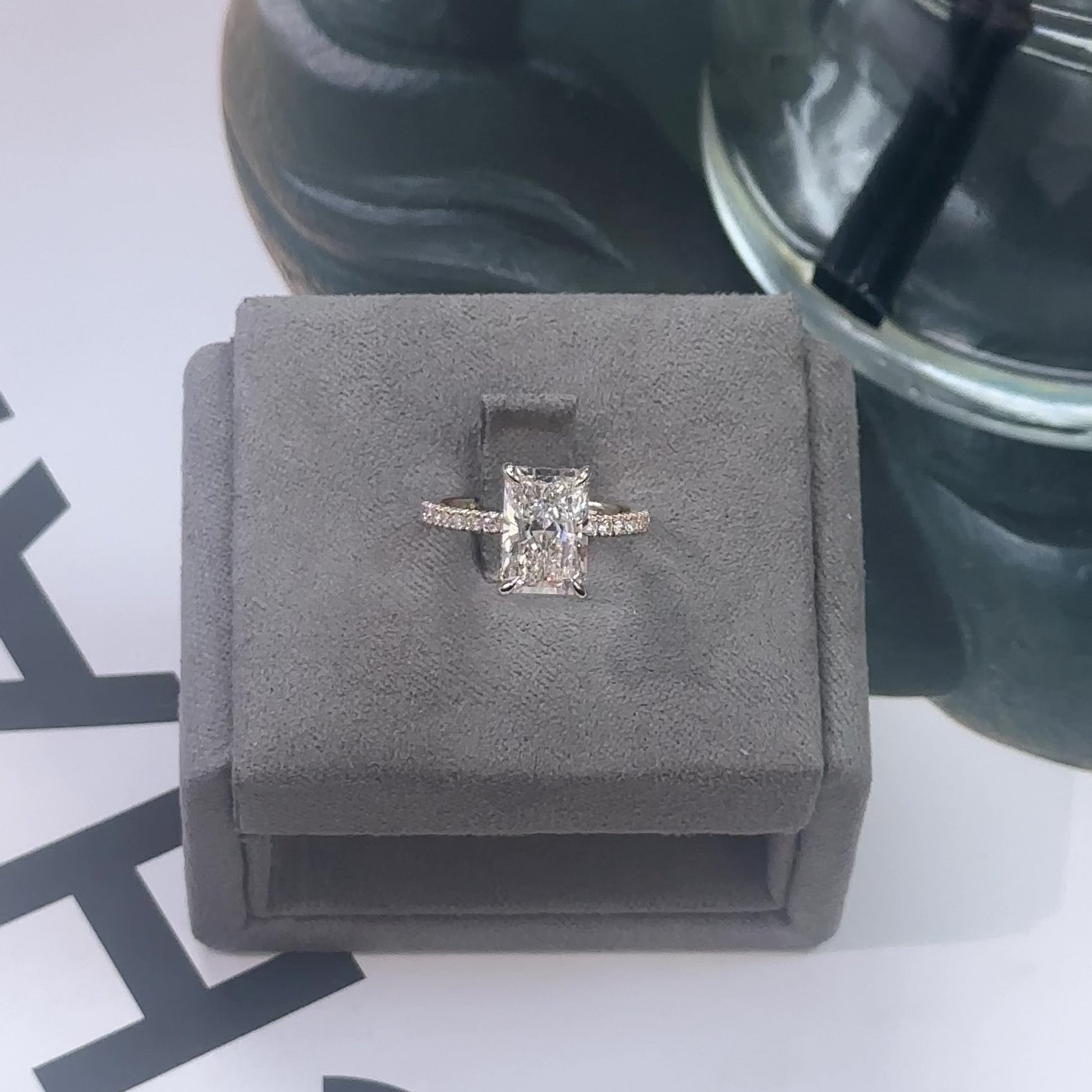 This ring features a dazzling 3.19 carat radiant cut lab-grown diamond, graded E color and VVS2 clarity, with Excellent polish and Excellent symmetry. Certified by IGI, this stone offers exceptional brightness and crisp facet definition, giving the radiant cut its signature intense sparkle and modern, elegant appeal.