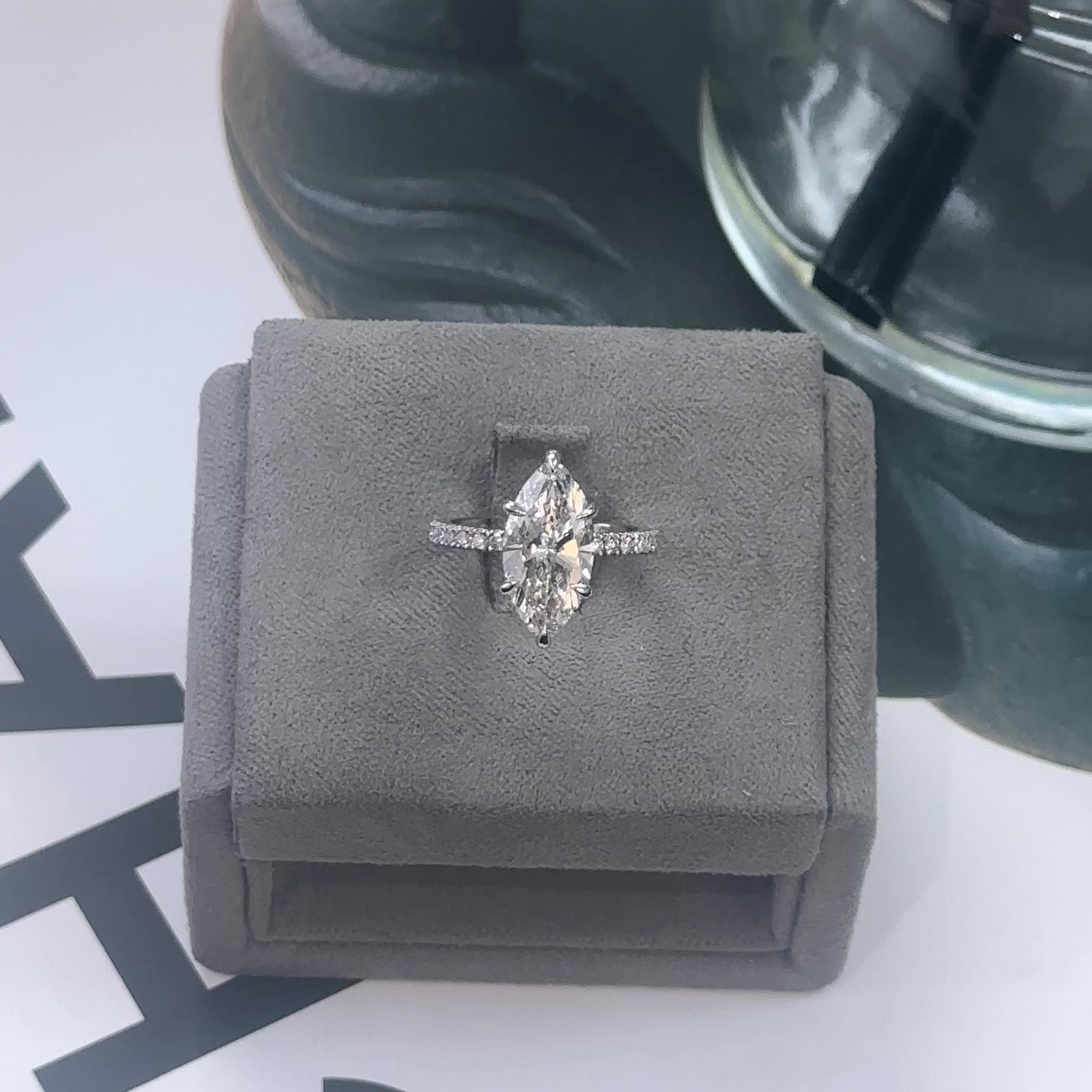 This ring features a stunning 3.02 carat marquise cut lab-grown diamond, graded E color and VVS2 clarity, with Excellent polish and Excellent symmetry. Certified by IGI, this diamond delivers exceptional brilliance and a beautifully elongated silhouette that creates an elegant, refined look on the hand.