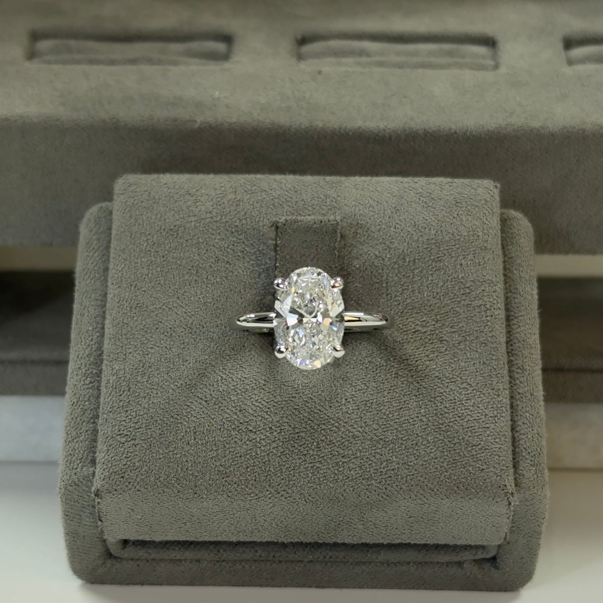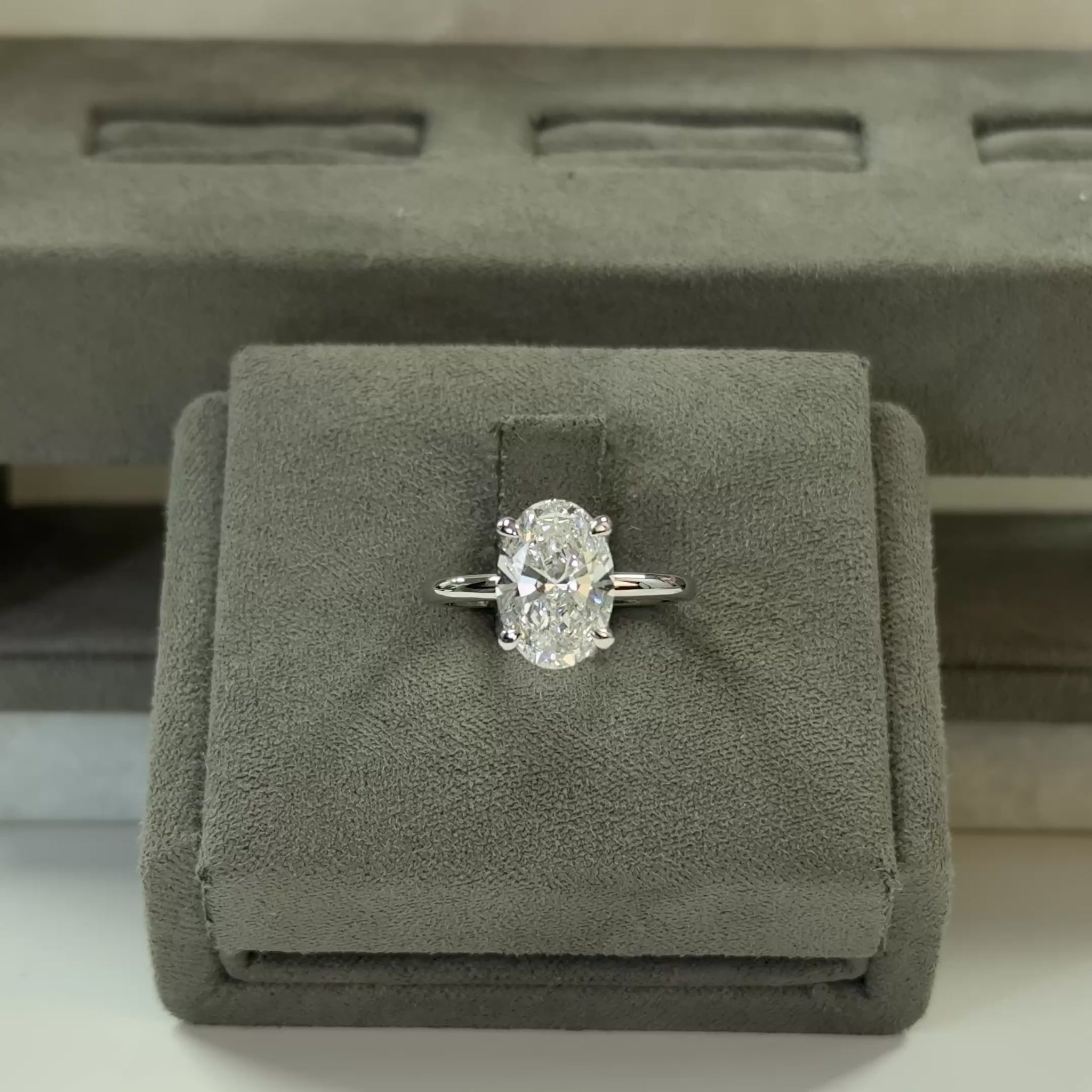 This ring showcases a 3.09 carat oval cut lab-grown diamond, graded D color and VS1 clarity, and certified by IGI. The oval cut’s elongated shape and brilliant faceting create exceptional sparkle with a refined, graceful silhouette.