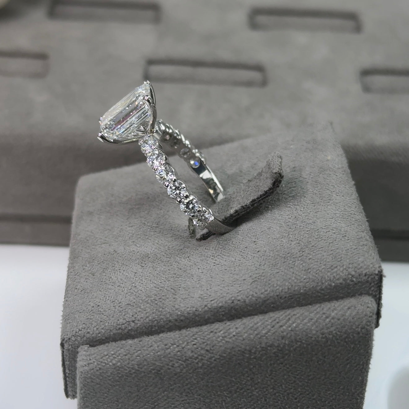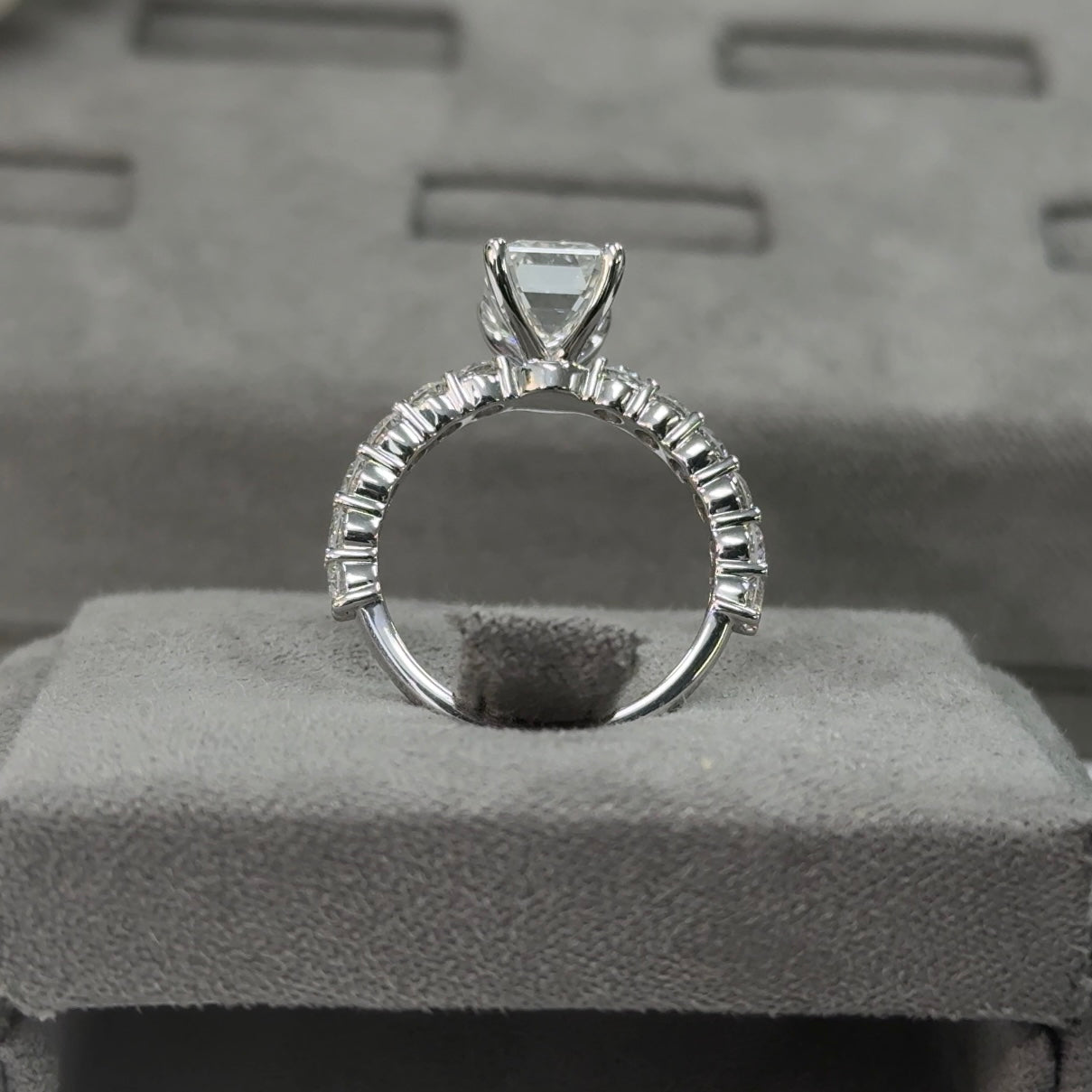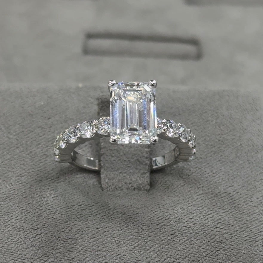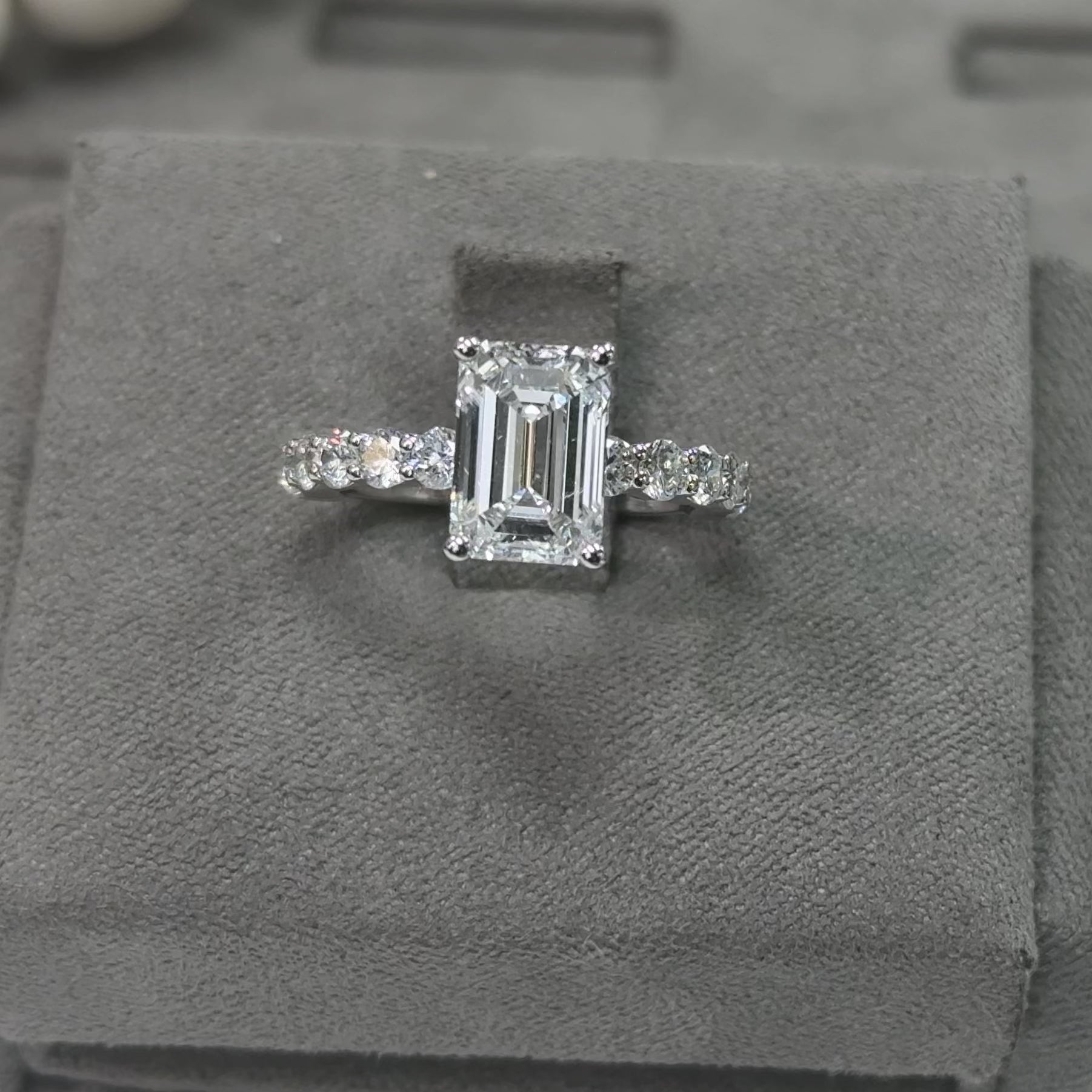 This ring features a 3.03 carat emerald cut lab-grown diamond, graded E color and VVS2 clarity, and certified by IGI. The oval cut offers timeless beauty with its elongated shape and brilliant faceting, delivering exceptional sparkle and flattering elegance.