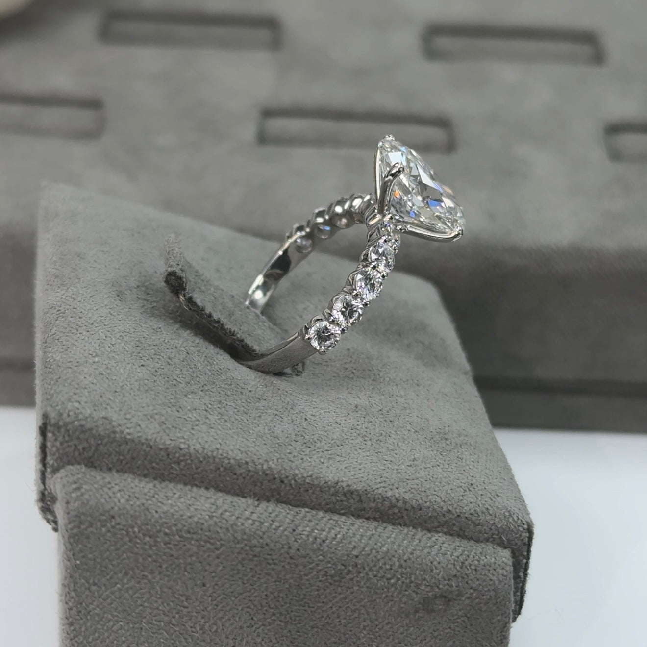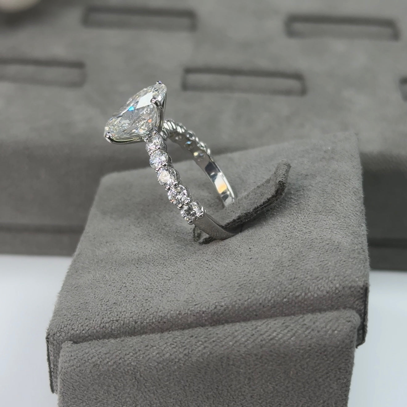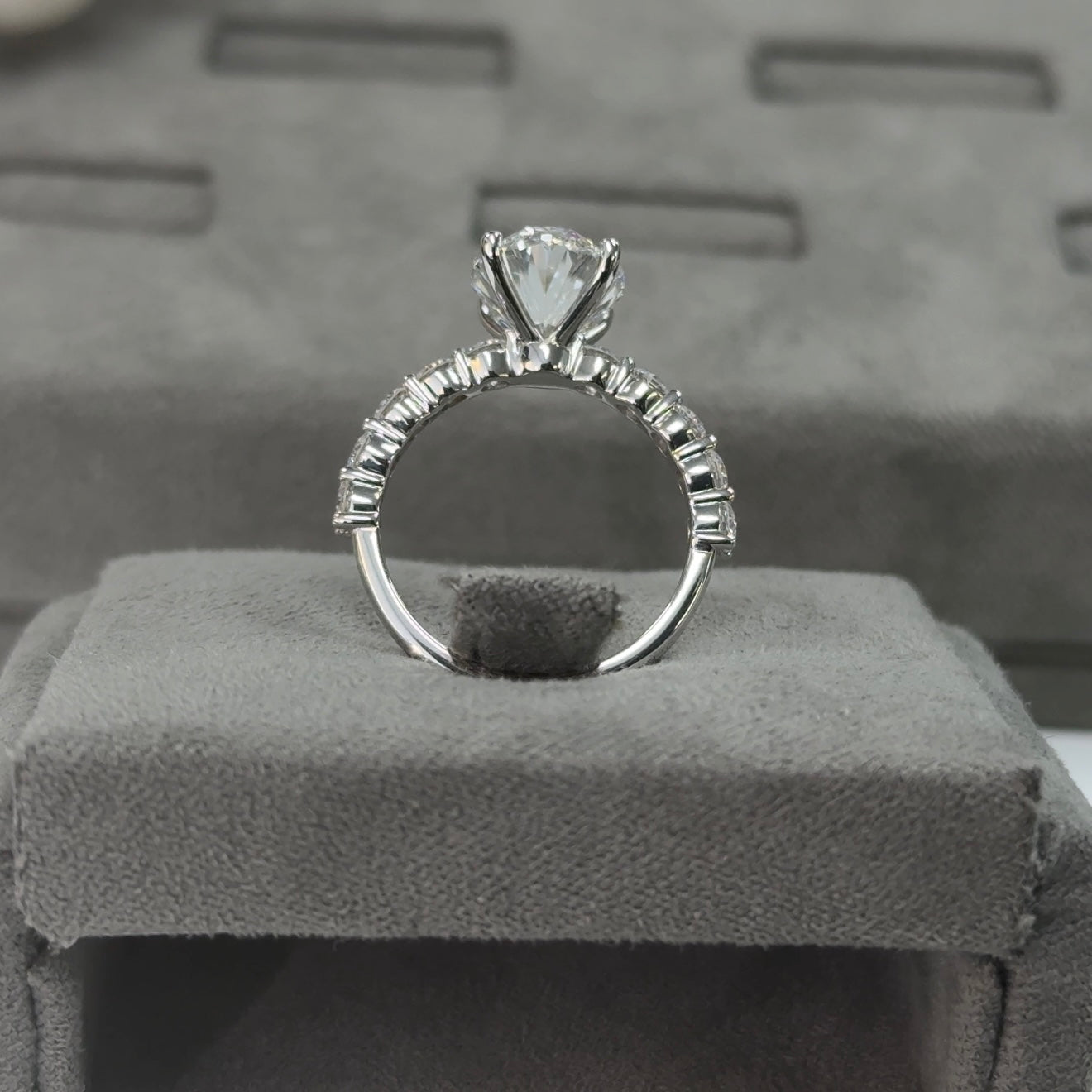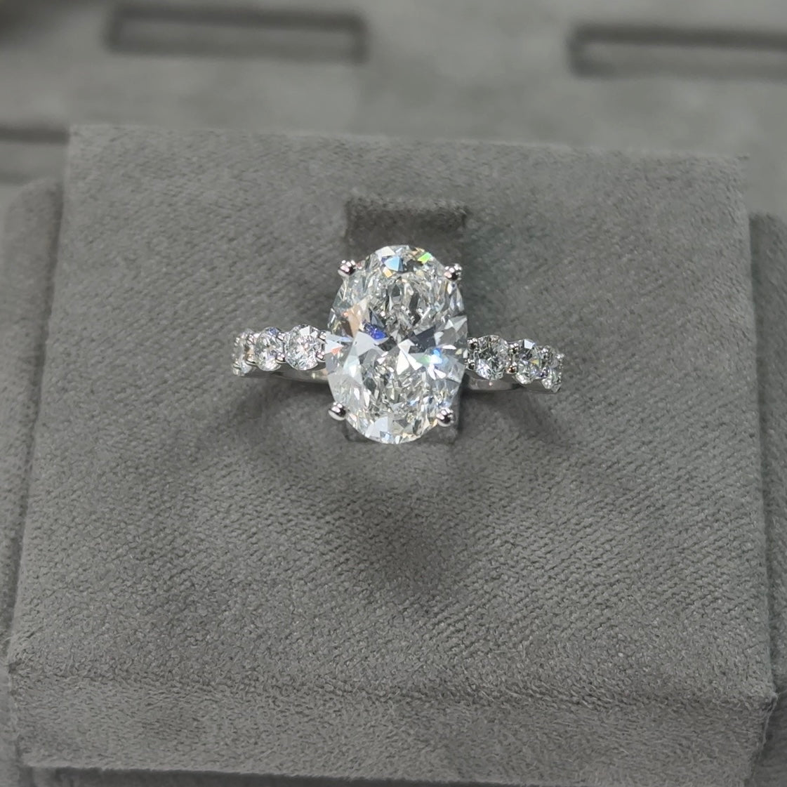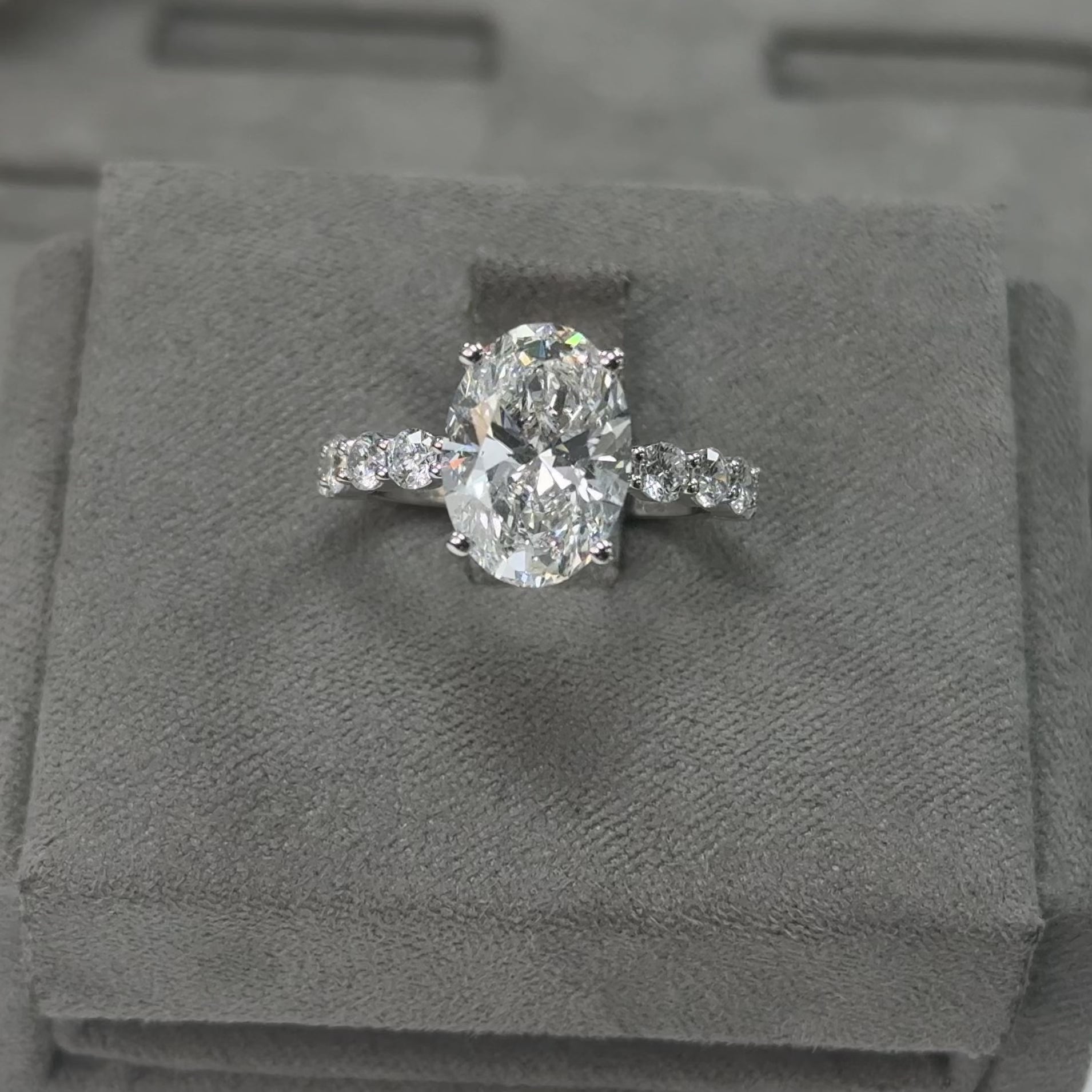 This ring features a 4.04 carat oval cut lab-grown diamond, graded E color and VVS2 clarity, and certified by IGI. The oval cut offers timeless beauty with its elongated shape and brilliant faceting, delivering exceptional sparkle and flattering elegance.