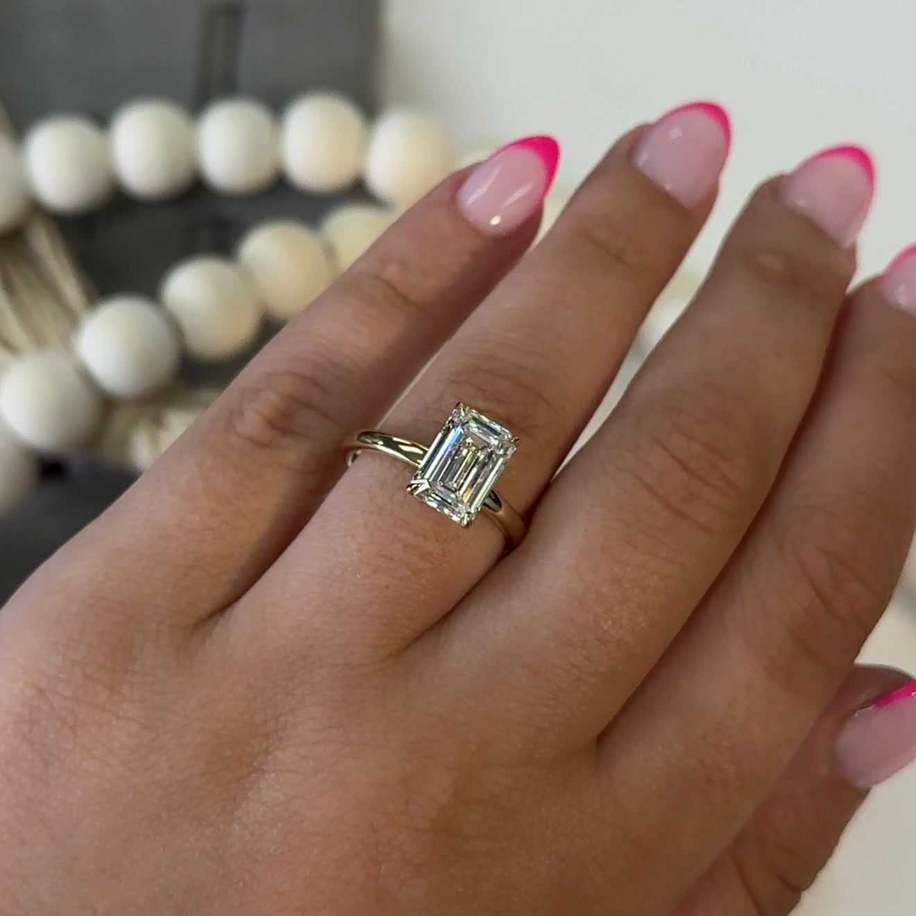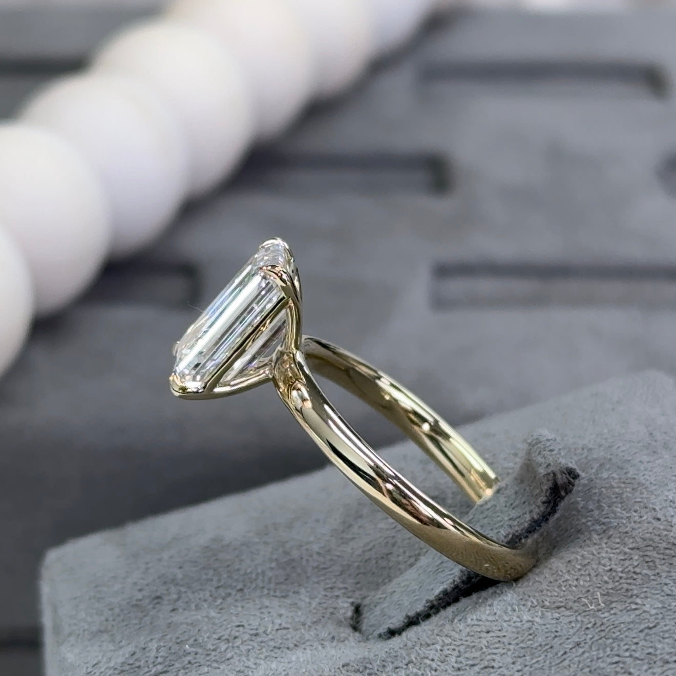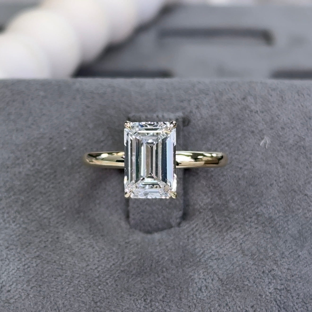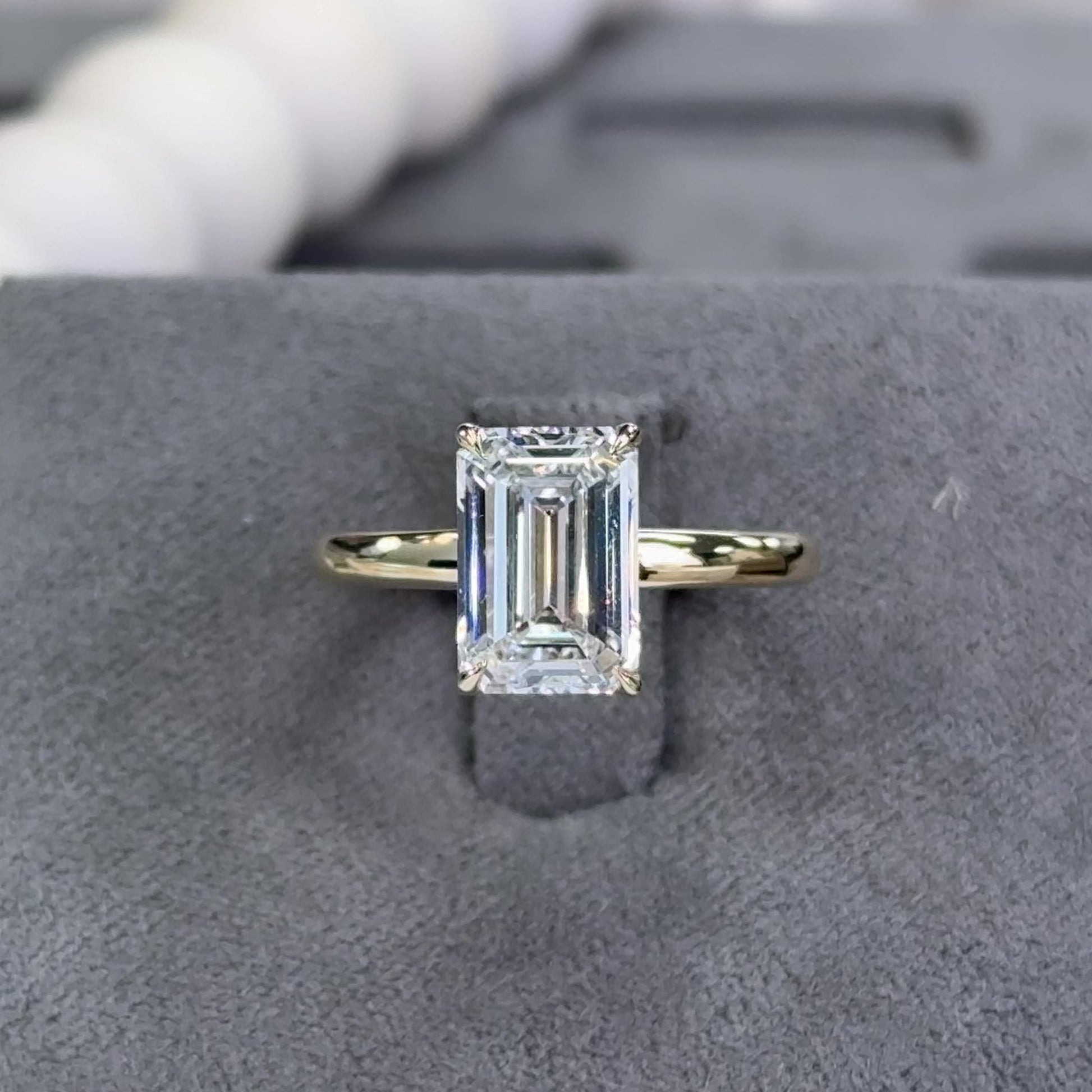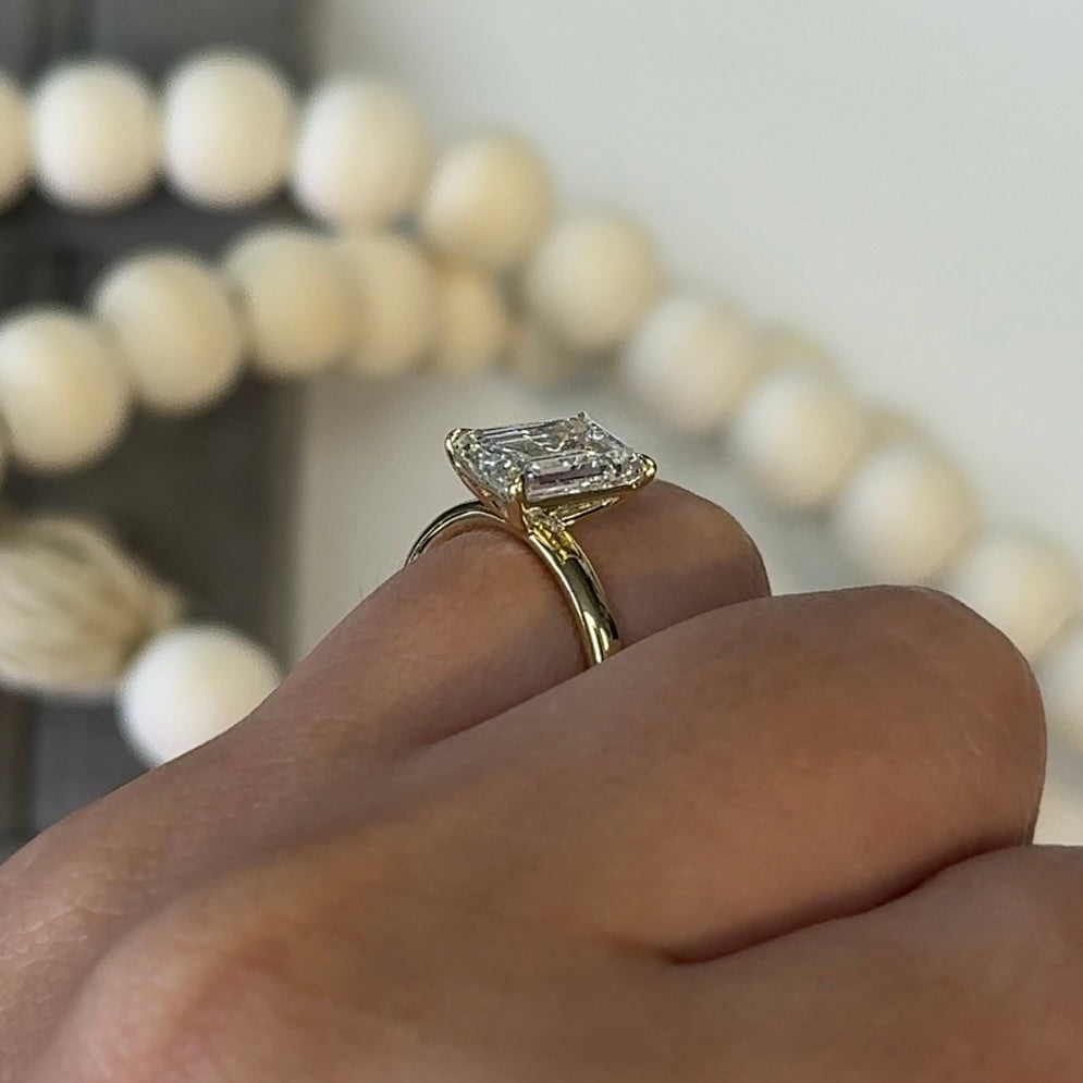 This elegant ring showcases a 3.02 carat emerald-cut lab-grown diamond, graded E color and VS1 clarity, and certified by IGI. The emerald cut is known for its clean lines and sophisticated step facets, offering a hall-of-mirrors effect that emphasizes clarity and luster over sparkle—perfect for those with refined, minimalist taste.