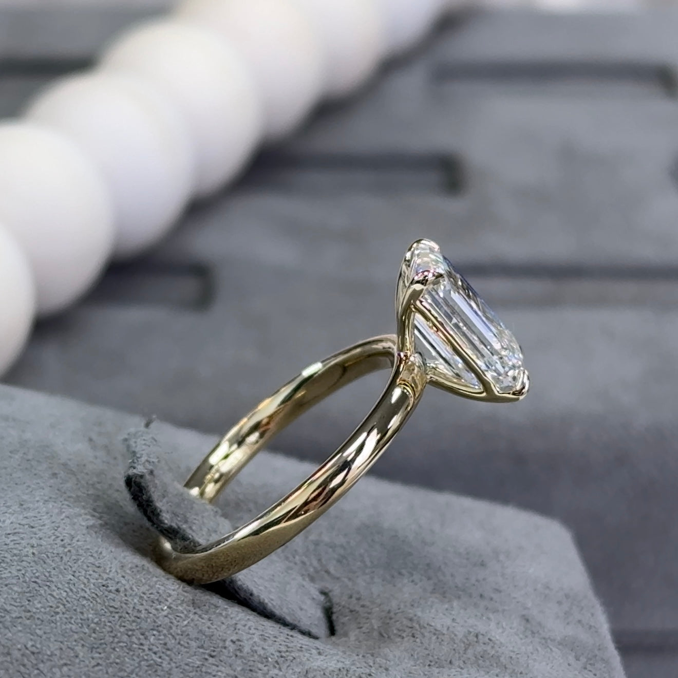 Set in a classic solitaire design, the diamond is the true centerpiece, held securely in a timeless four-prong setting. The elongated shape of the emerald cut adds graceful length to the finger, while the polished 14K yellow gold band provides a sleek, modern foundation that complements the diamond’s elegance.