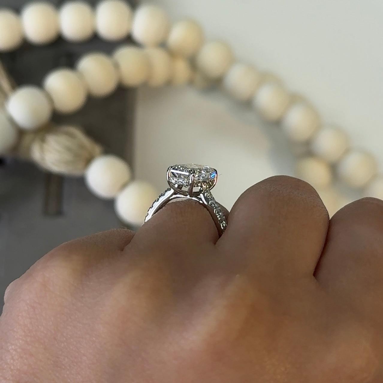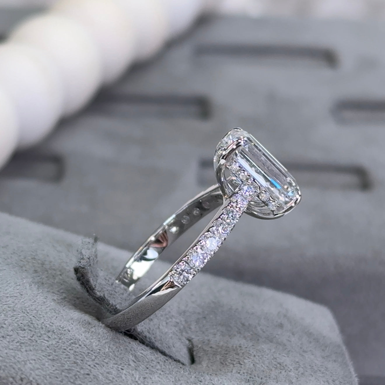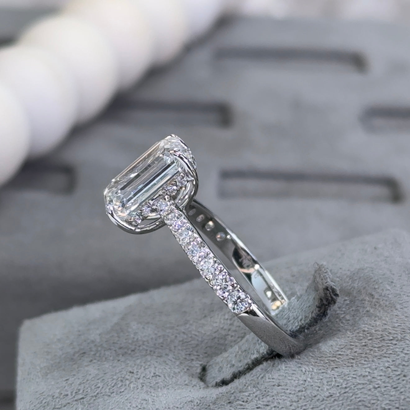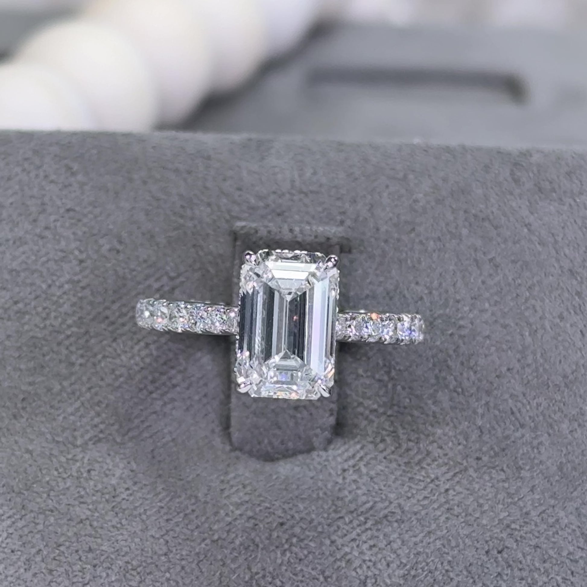 This sophisticated ring features a 3.01 carat emerald-cut lab-grown diamond, graded E color and VS1 clarity, and certified by IGI. The emerald cut, known for its elegant step facets and elongated silhouette, offers a sleek hall-of-mirrors effect that highlights the diamond’s clarity and luster—a perfect choice for those who appreciate refined, understated beauty.