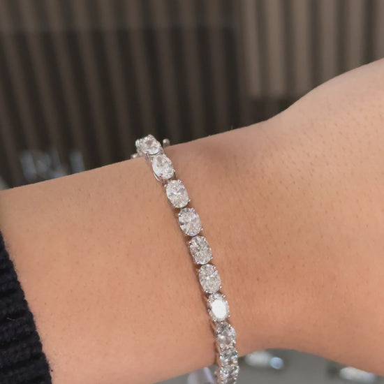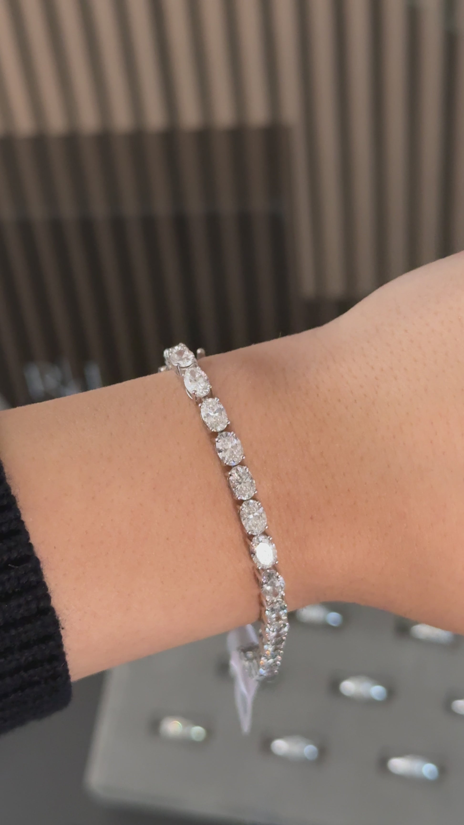 With an elegant design, double locking clasps, 11.96 carats of D color VVS2 clarity lab oval lab diamonds, and 4.20mm wide, this bracelet is one of a kind. Hand-set 14kt white gold and secure, it is the perfect addition to any jewelry collection. This bracelet is 7 inches long and can be resized. This bracelet does not come with a certificate.