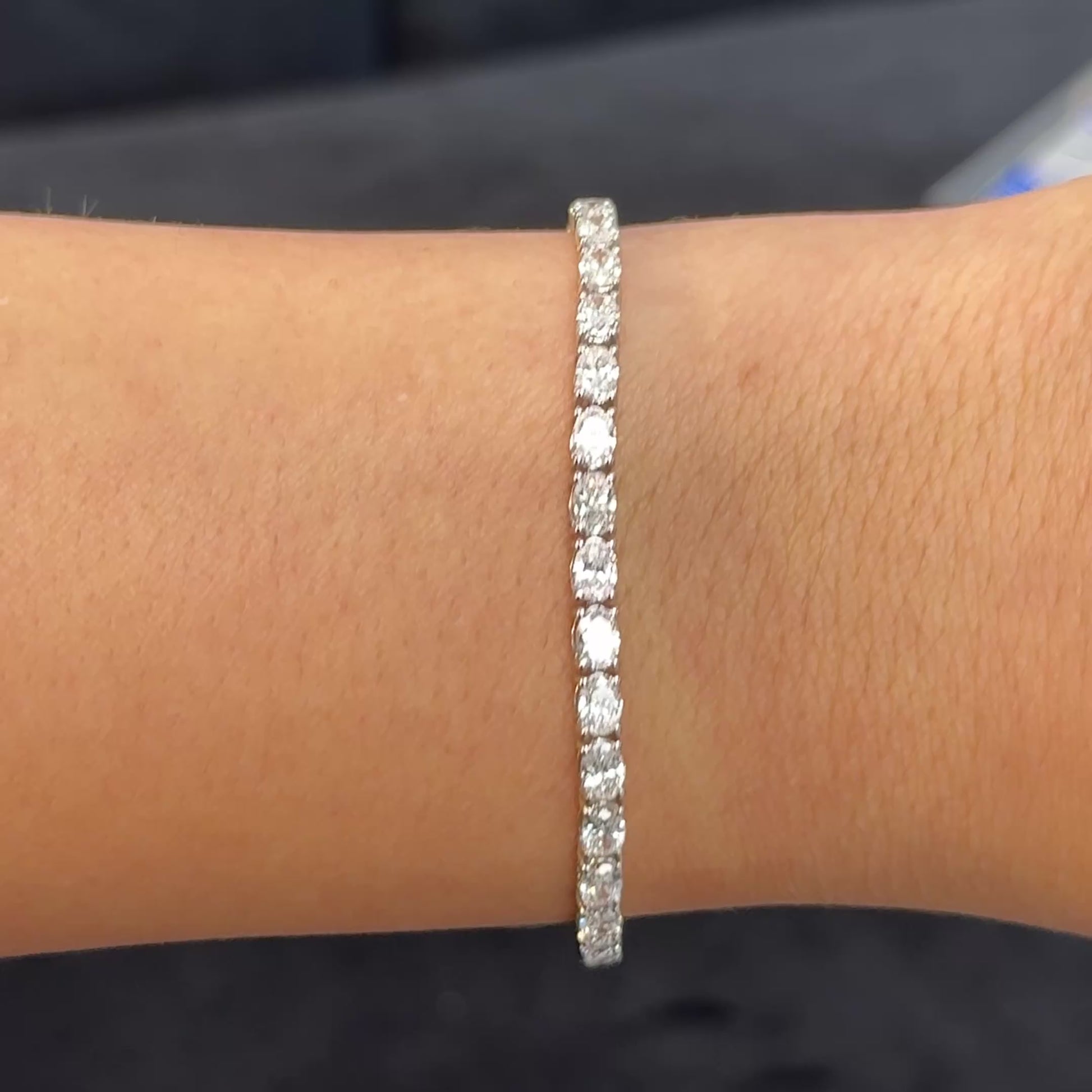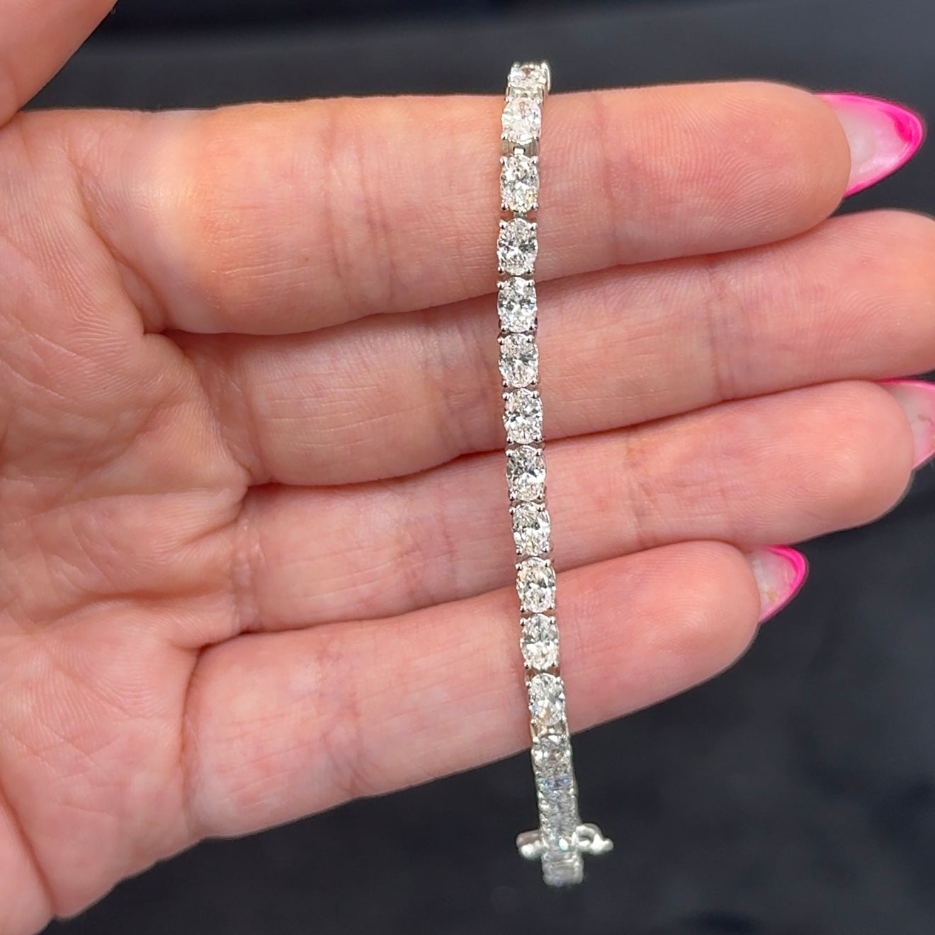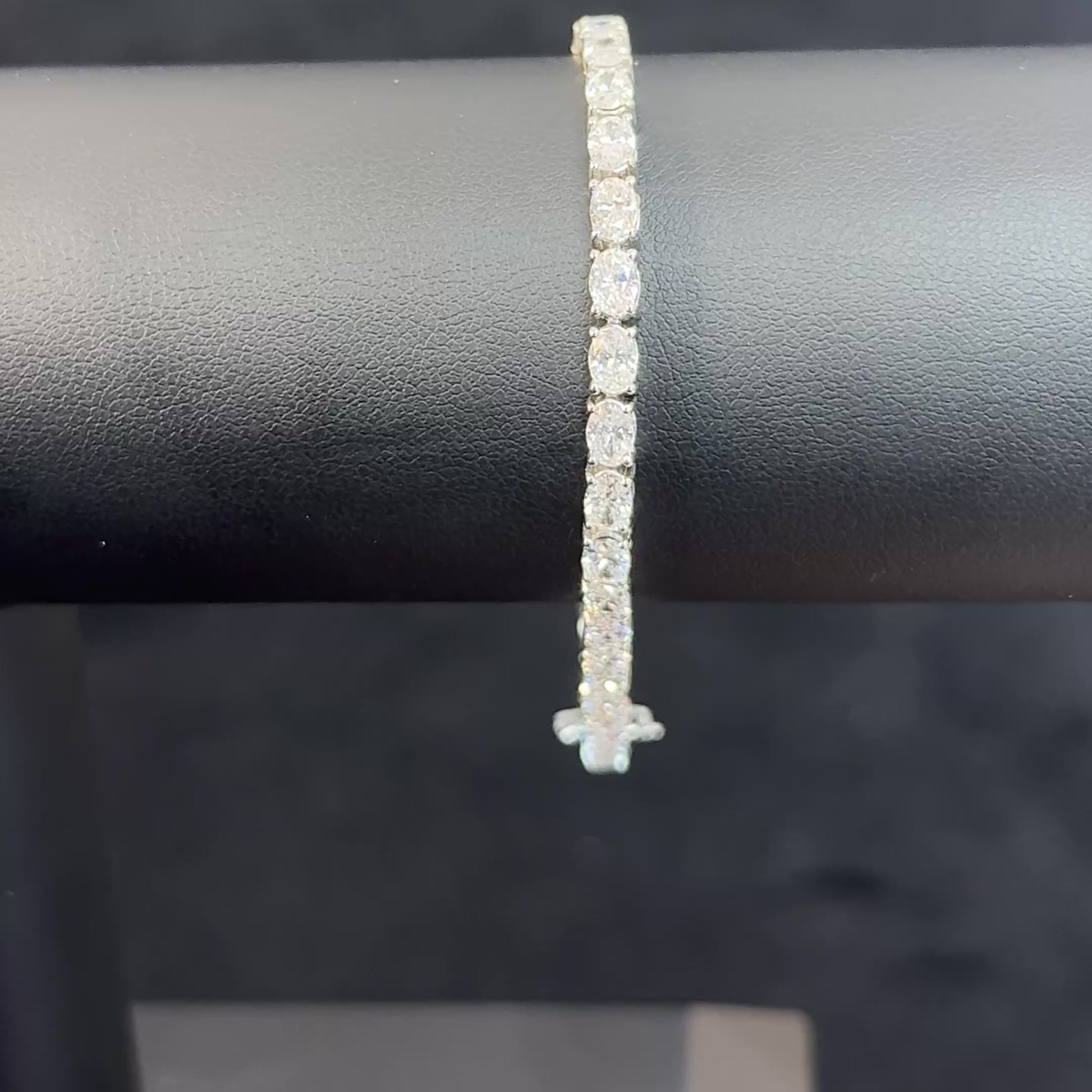 With an elegant design, double locking clasps, 12.00 carats of D color VVS2 clarity lab oval diamonds, and 4.20mm wide, this bracelet is one of a kind. Hand-set 14kt white gold and secure, it is the perfect addition to any jewelry collection. This bracelet is 7 inches long and can be resized.