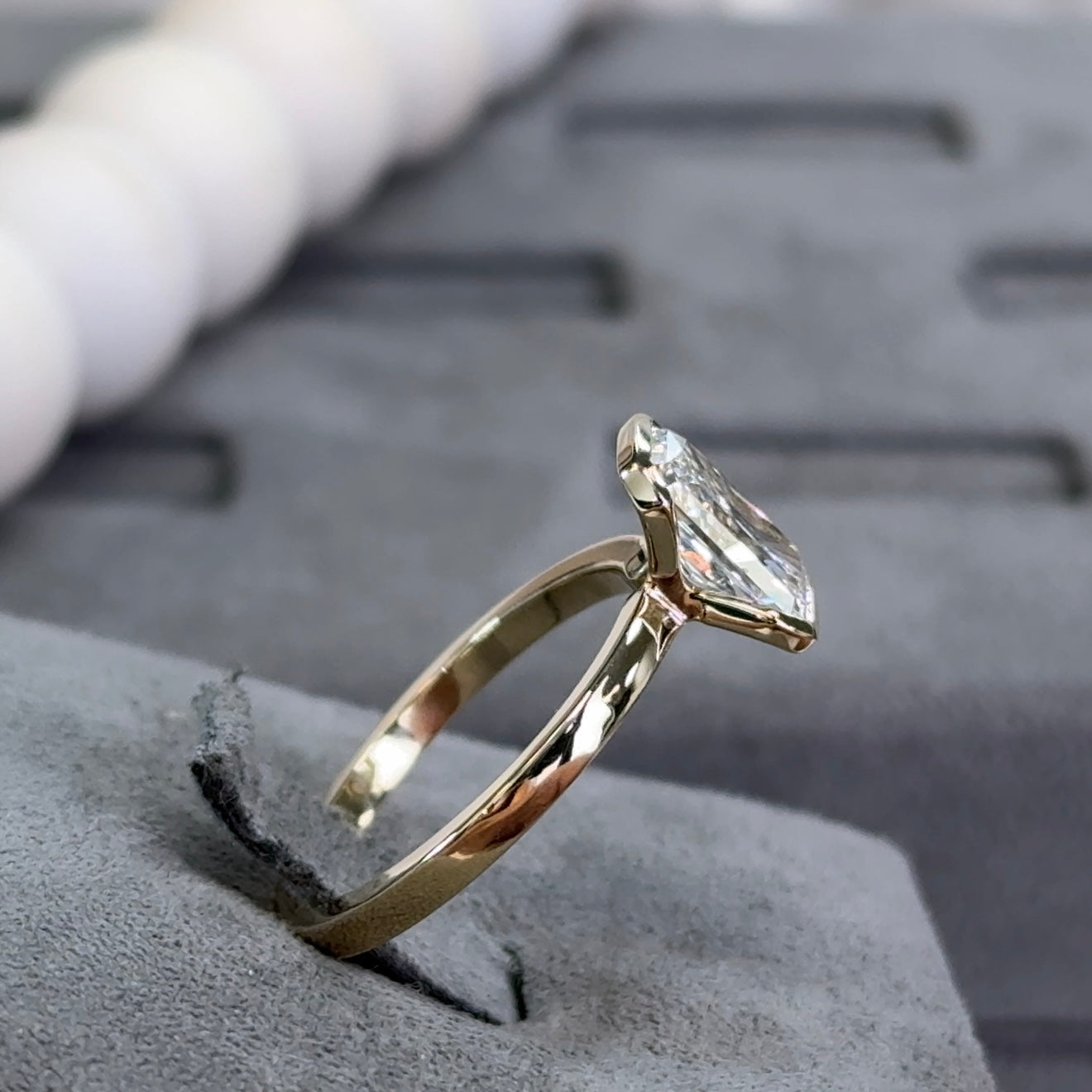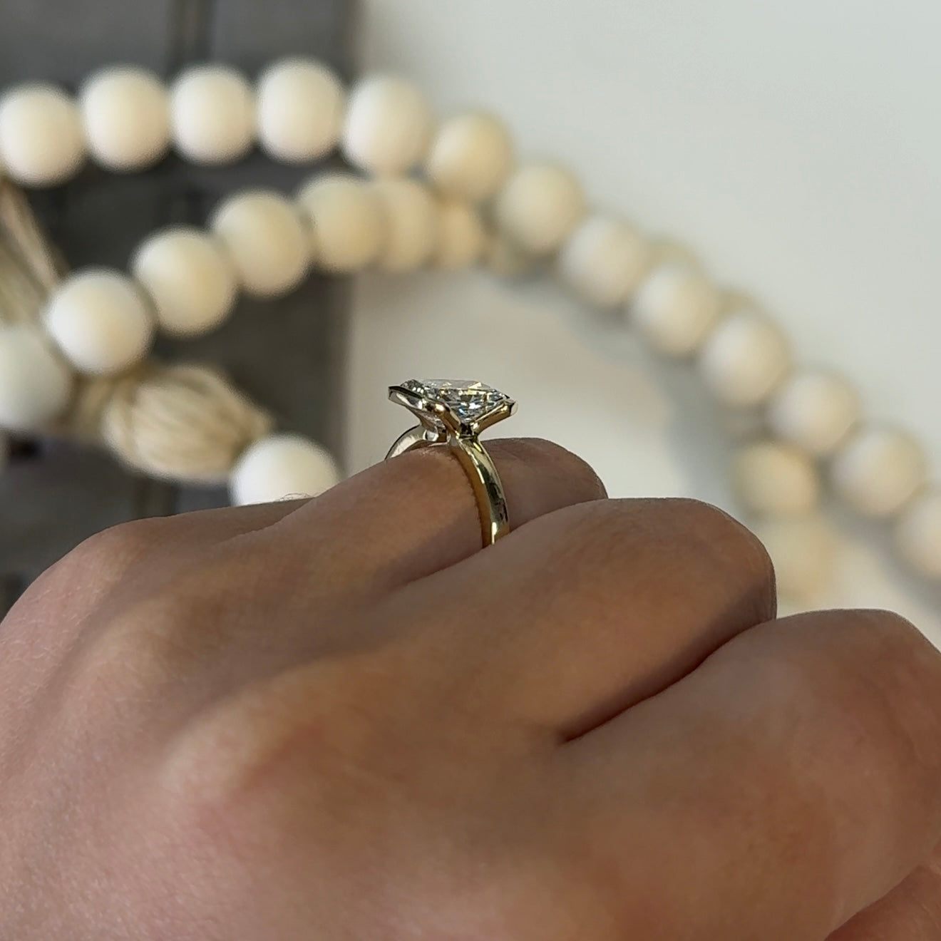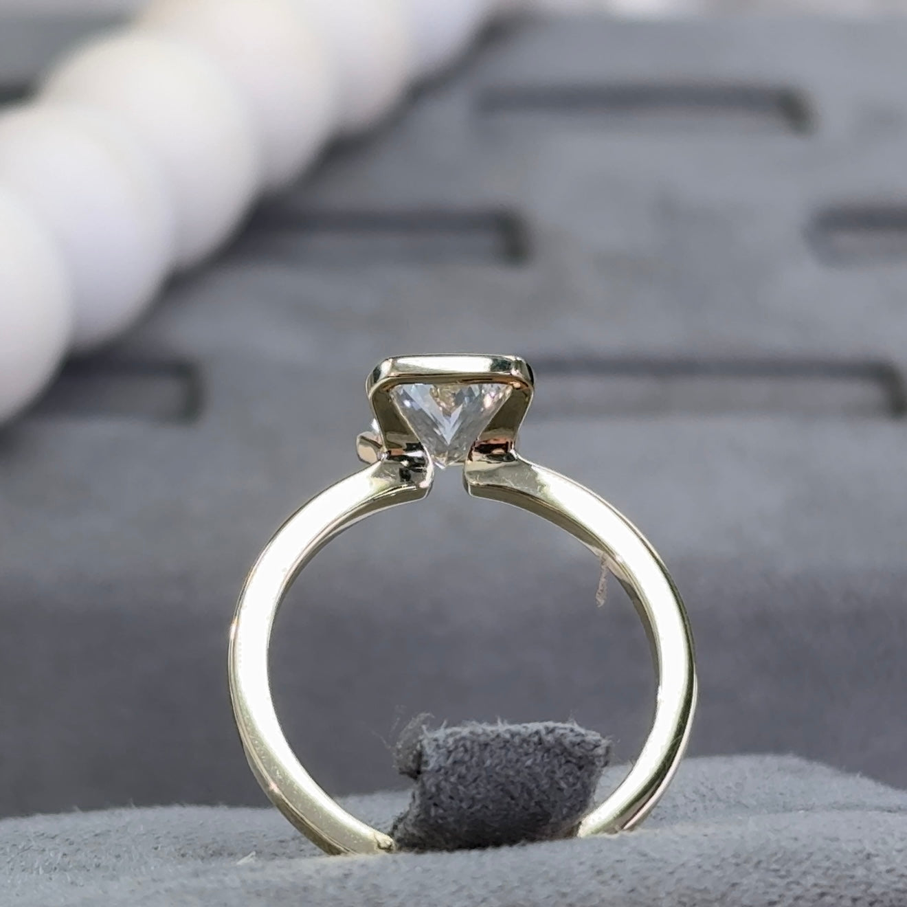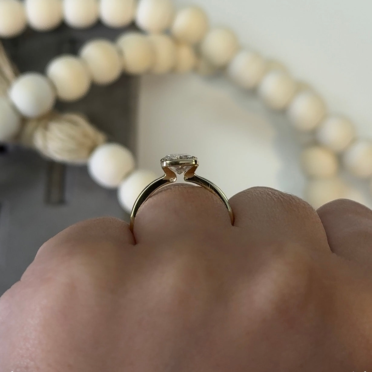 The diamond is held securely in a half bezel solitaire setting, where smooth metal arcs gently cradle the stone’s corners while leaving its center open to the light. This setting offers a contemporary look while maintaining a sense of classic elegance.