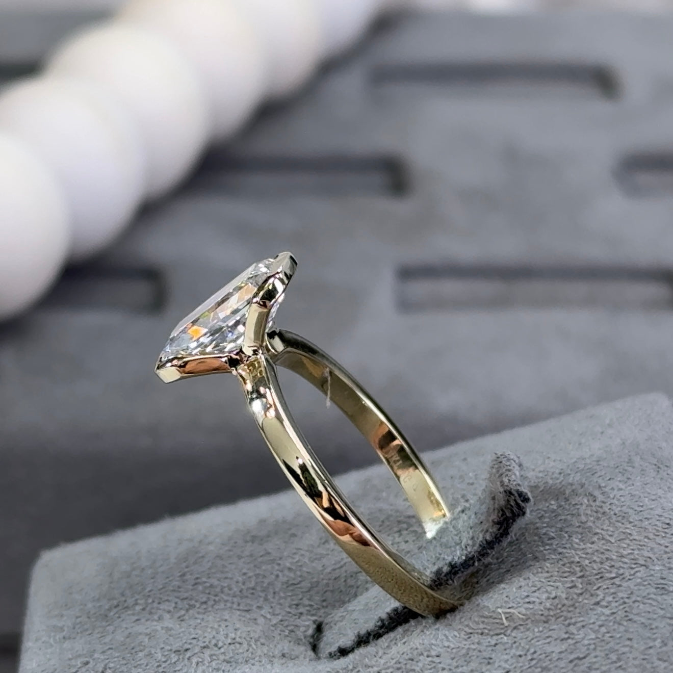 Crafted in 14K yellow gold, the warm-toned band creates a striking contrast against the diamond’s icy brilliance, enhancing both the fire and form of the centerpiece.