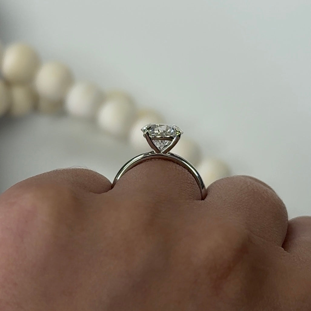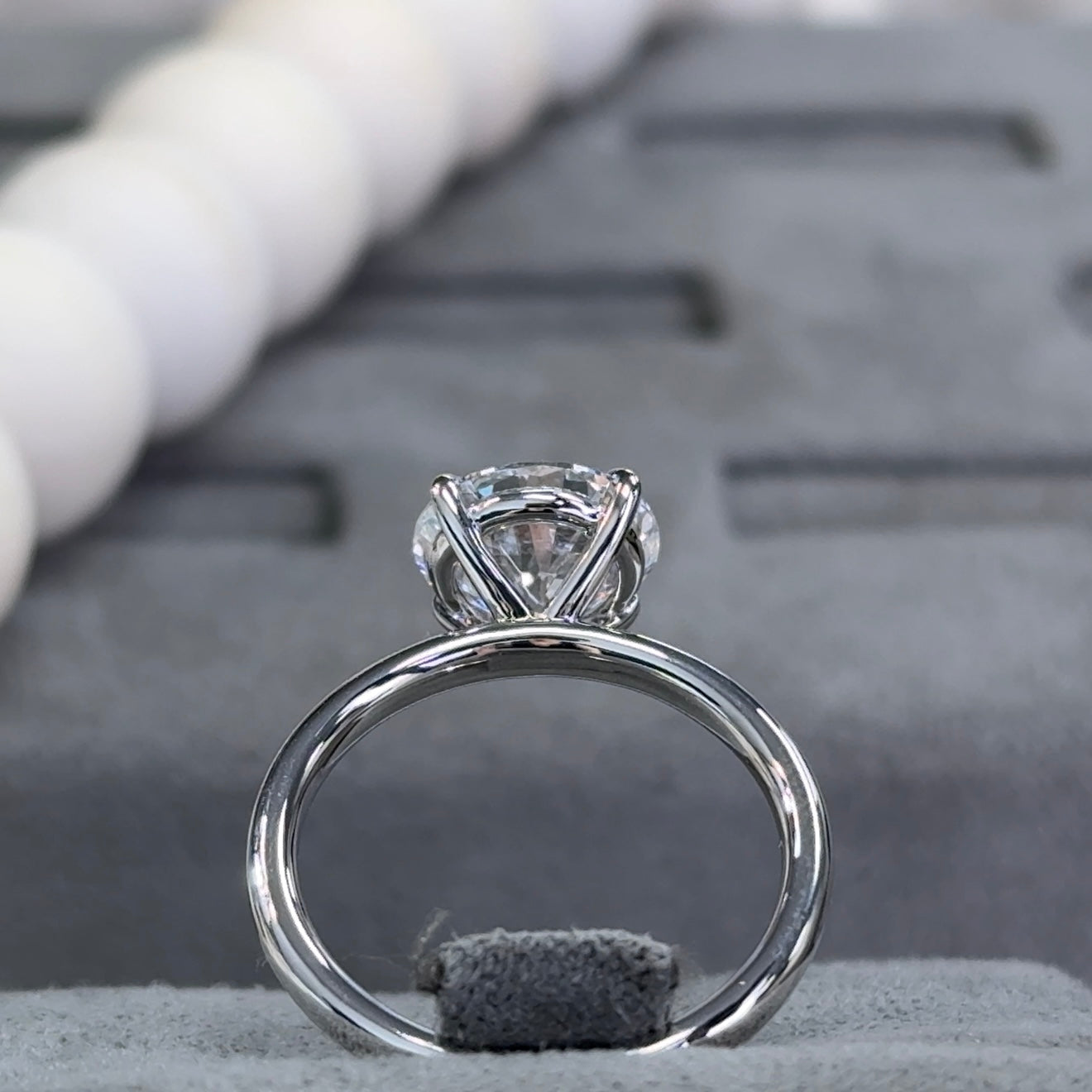 This ring features a 3.03 carat round brilliant lab-grown diamond, graded E color and VS1 clarity Ideal cut, offering excellent brightness and precision. The round cut is known for its classic symmetry and ability to maximize light return.