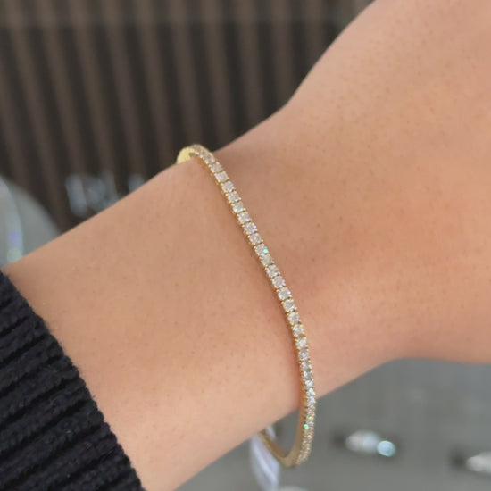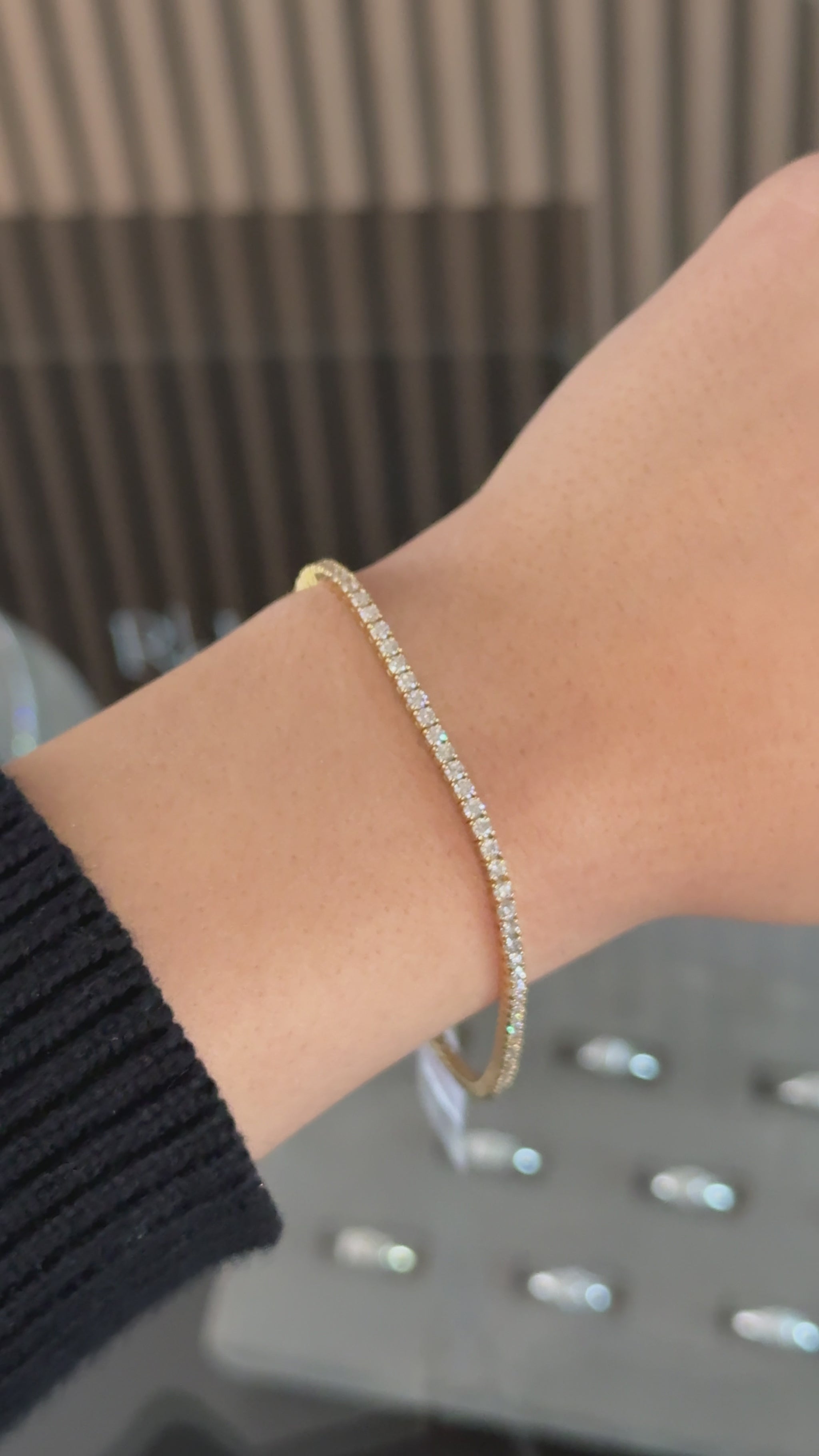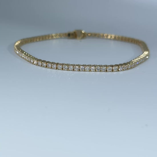 With an elegant design, 2.50 carats of E-F color VVS2-VS1 clarity lab round diamonds, and 2.30mm wide, EGL certified, this bracelet is one of a kind. Hand-set 14kt yellow gold is secure, its the perfect addition to any jewelry collection. This bracelet is 7 inches long and can be resized.