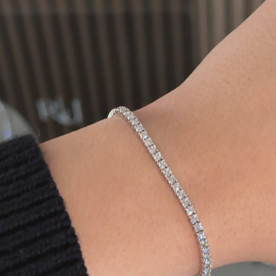 With an elegant design, 2.71 carats of E-F color VS1-VVS2 clarity lab round diamonds, and 2.30mm wide, EGL certified, this bracelet is one of a kind. Hand-set 14kt white gold is secure, its the perfect addition to any jewelry collection. This bracelet is 7 inches long and can be resized.